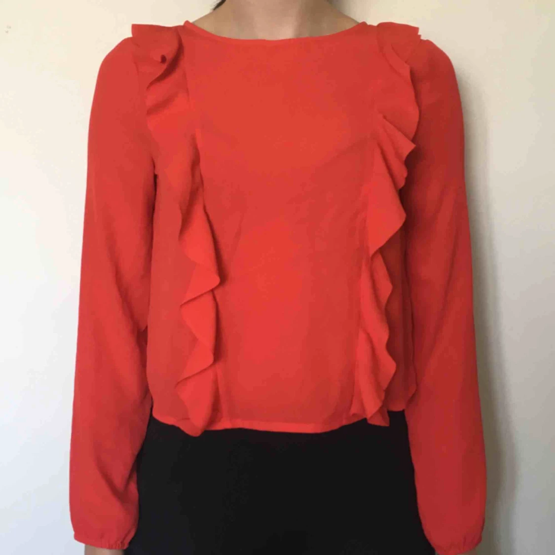 Röd blus med volanger på framsidan. Litet hål bakom ena volangen🌼
