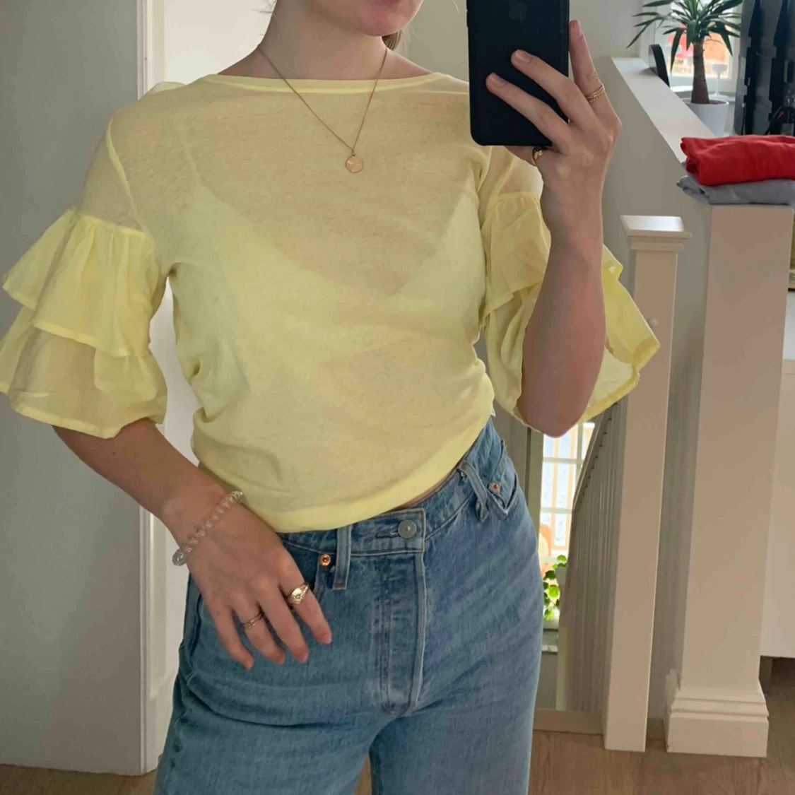 Ljusgul tunn tröja/blus från hm med volanger på ärmarna. Aldrig använd, jätteskön. Frakt tillkommer.