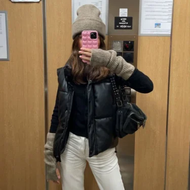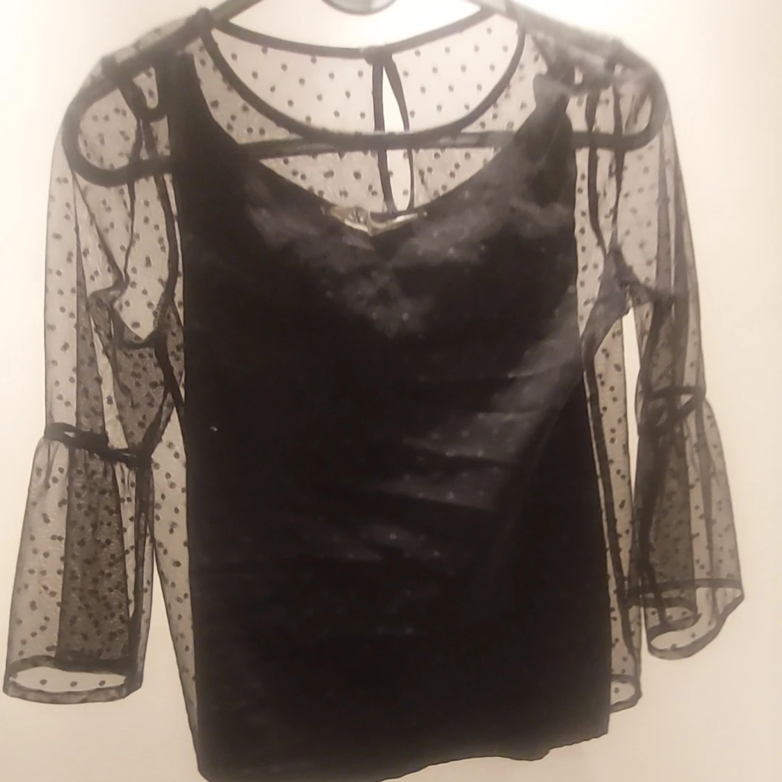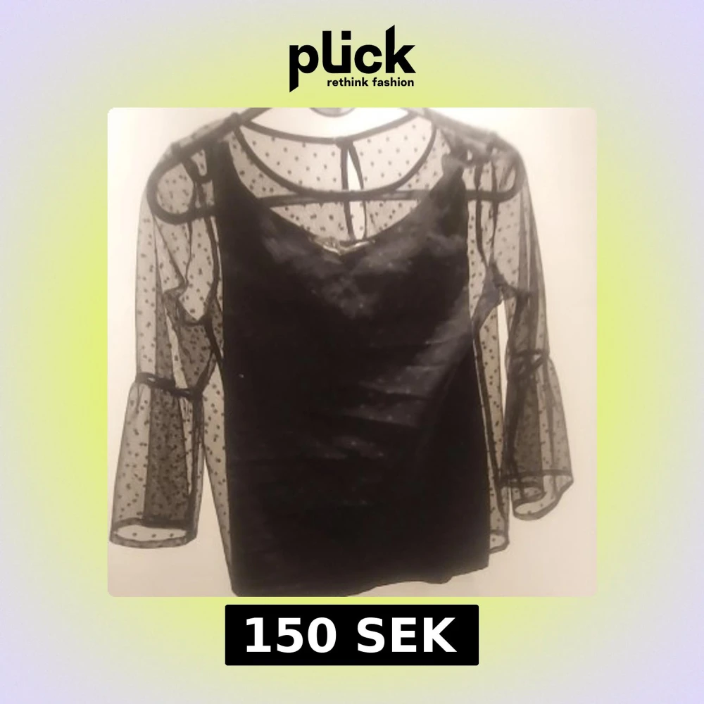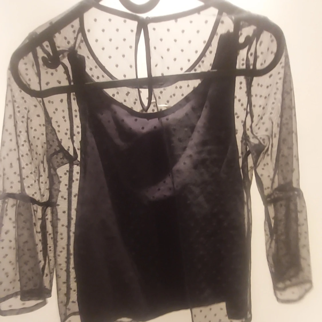 Svart prickig tröja som är genomskinlig vid armarna. Tröjan har en inbyggd svart linne.