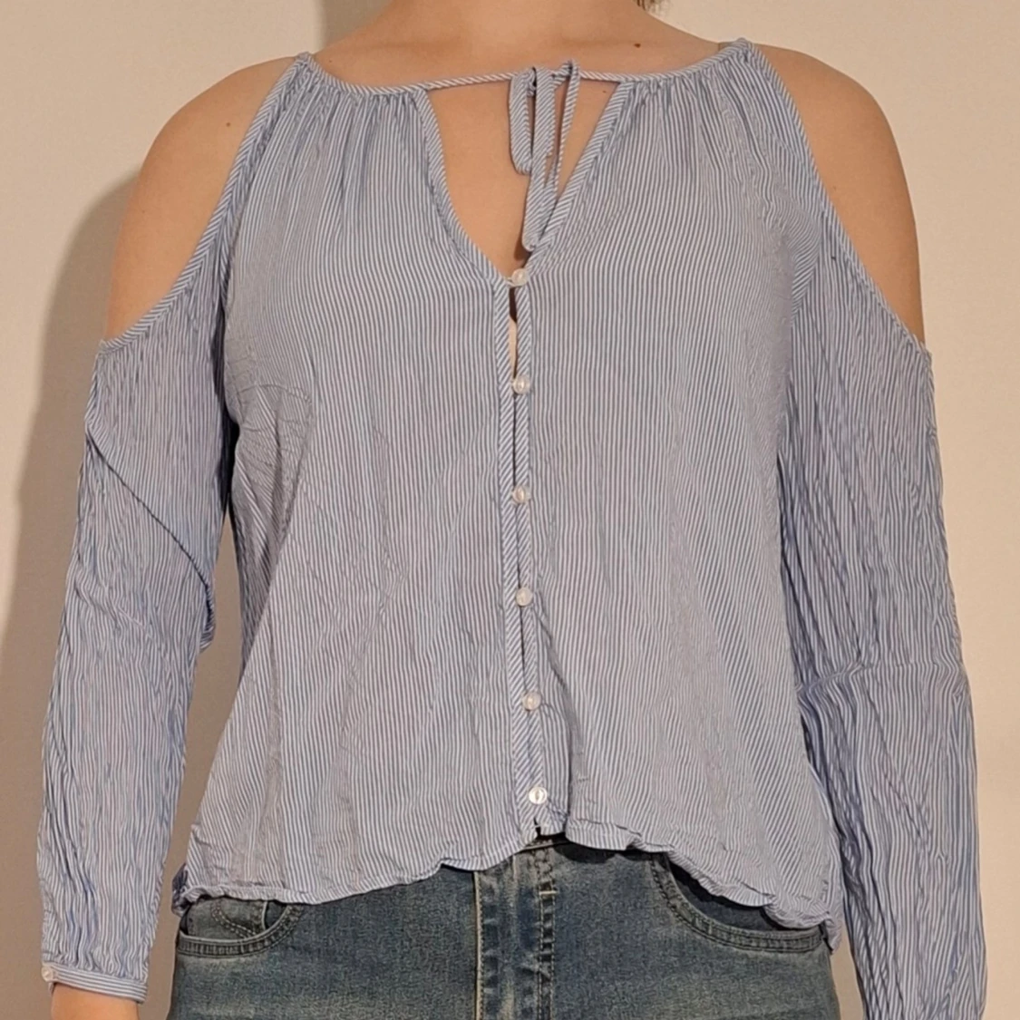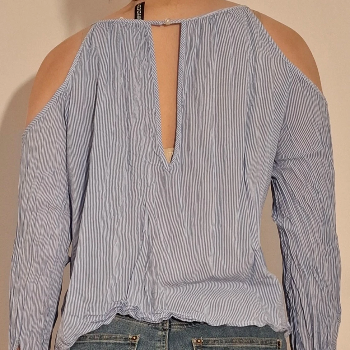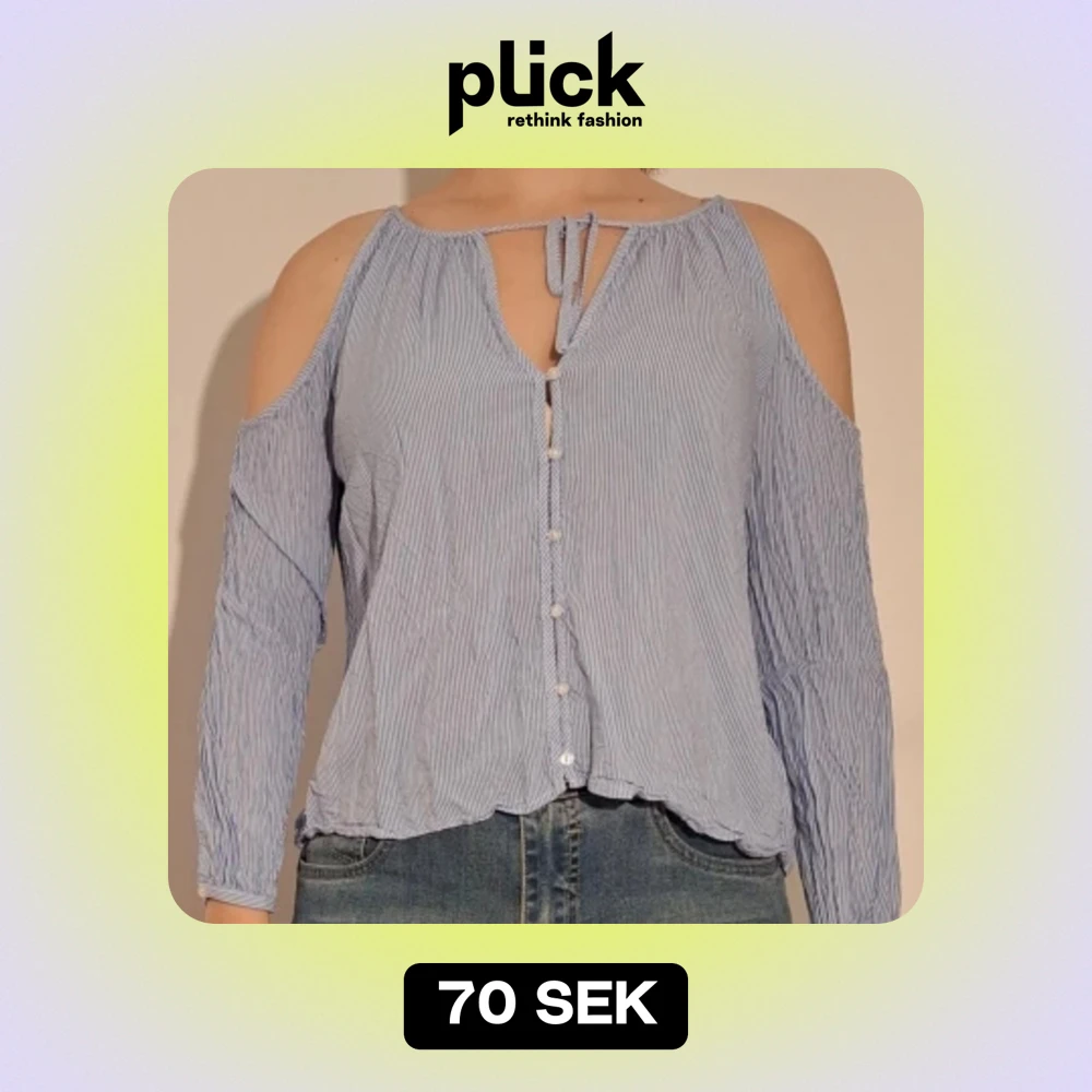 Blårandig blus med öppna axlar
