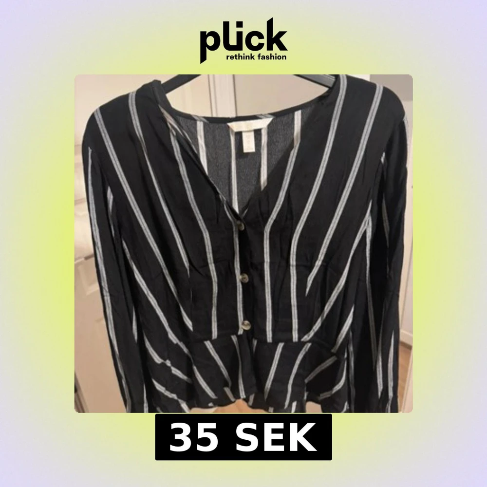 Säljer en svart blus med vita vertikala ränder från H&M. Blusen har v-ringning, knappar framtill och långa ärmar. Storlek L men passar också M