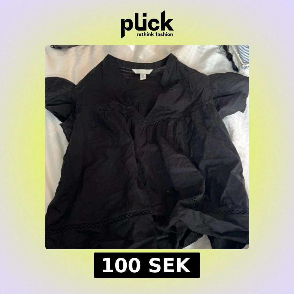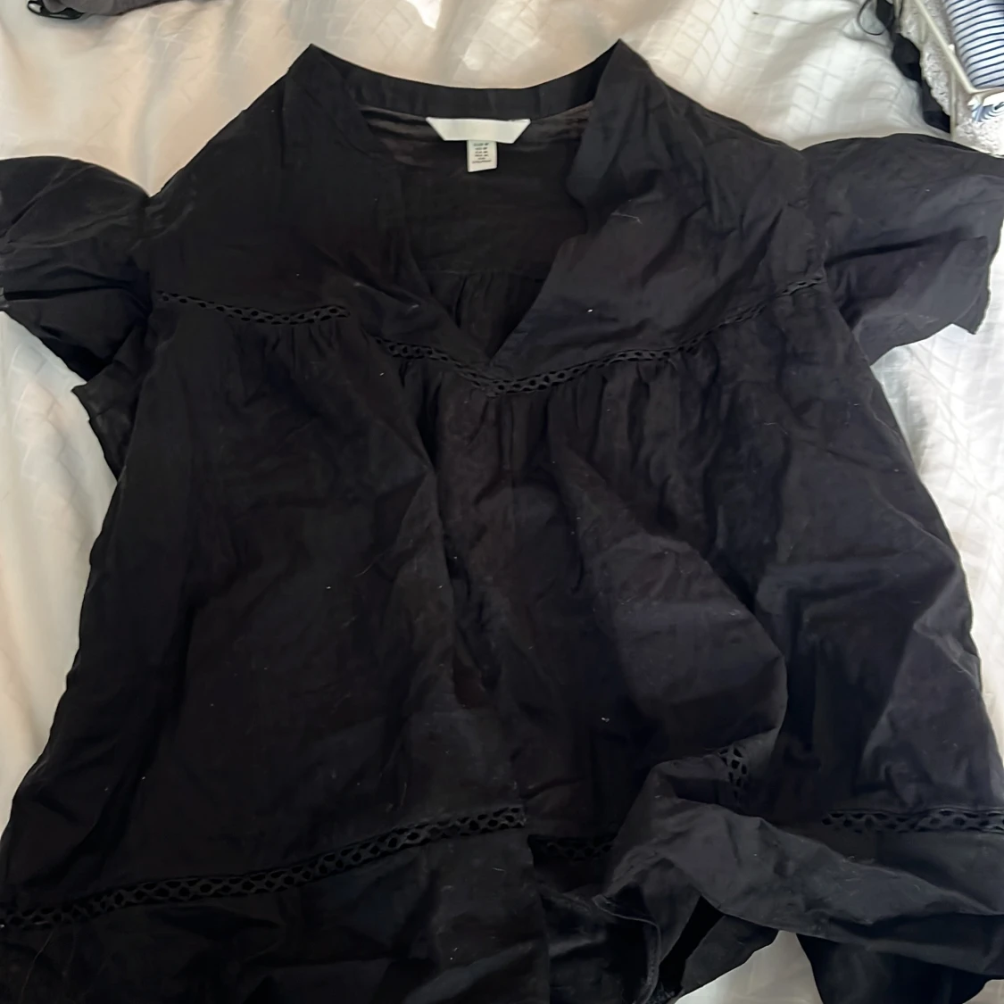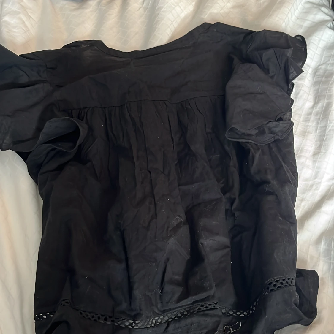 Svart blus från H&M i storlek M. Modellen är kort med korta puffärmar och har dekorativa spetsdetaljer vid halsringningen och nedtill. Blusen har en loose passform och är tillverkad i bomull, vilket gör den skön och luftig.