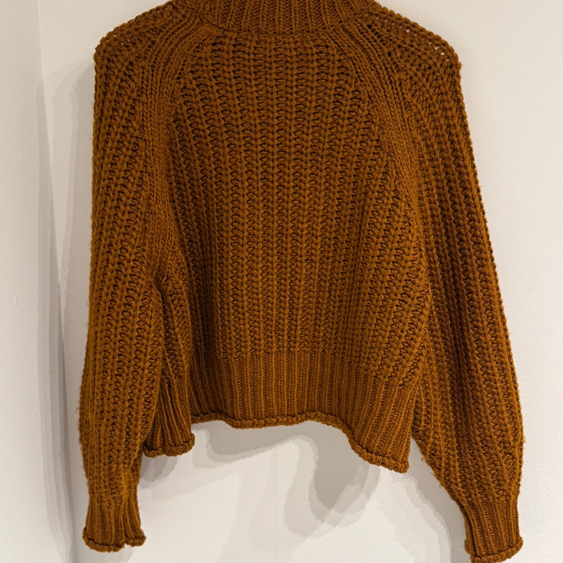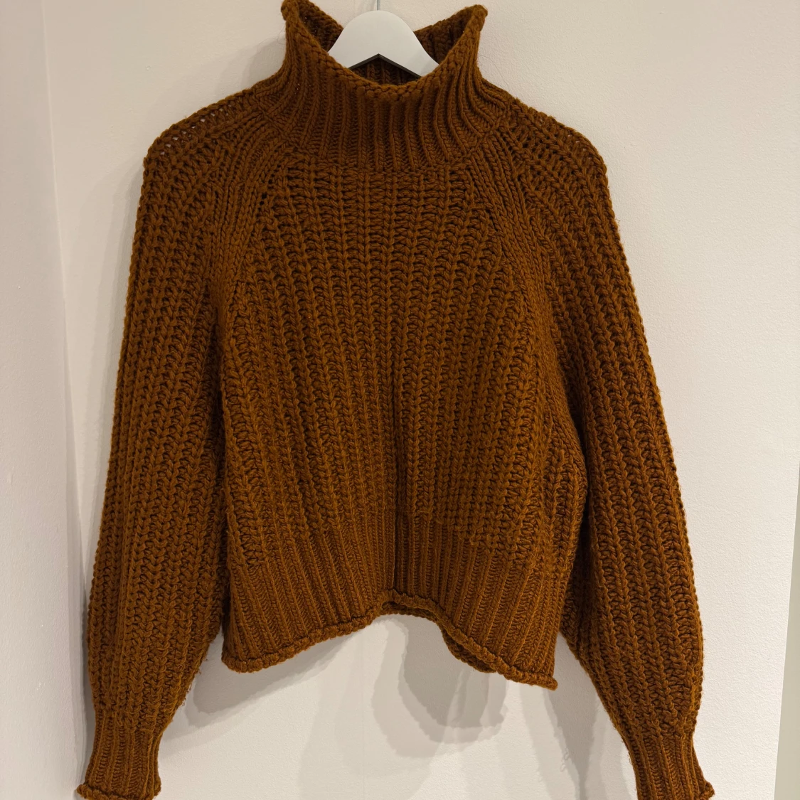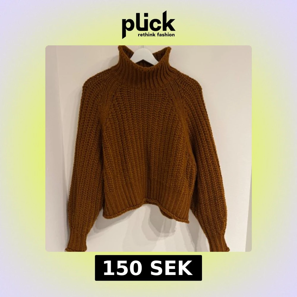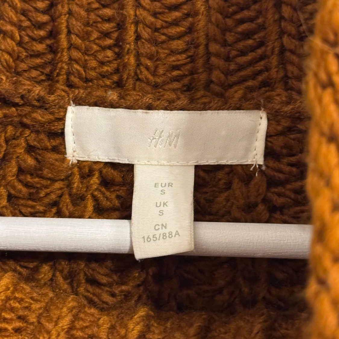 Säljer en chunky brun stickad polotröja från H&M i storlek S. Tröjan har hög krage, grov ribbstickning och långa ärmar med breda muddar. Perfekt för dig som gillar en cozy och trendig look under kyliga dagar.