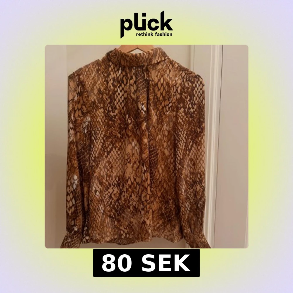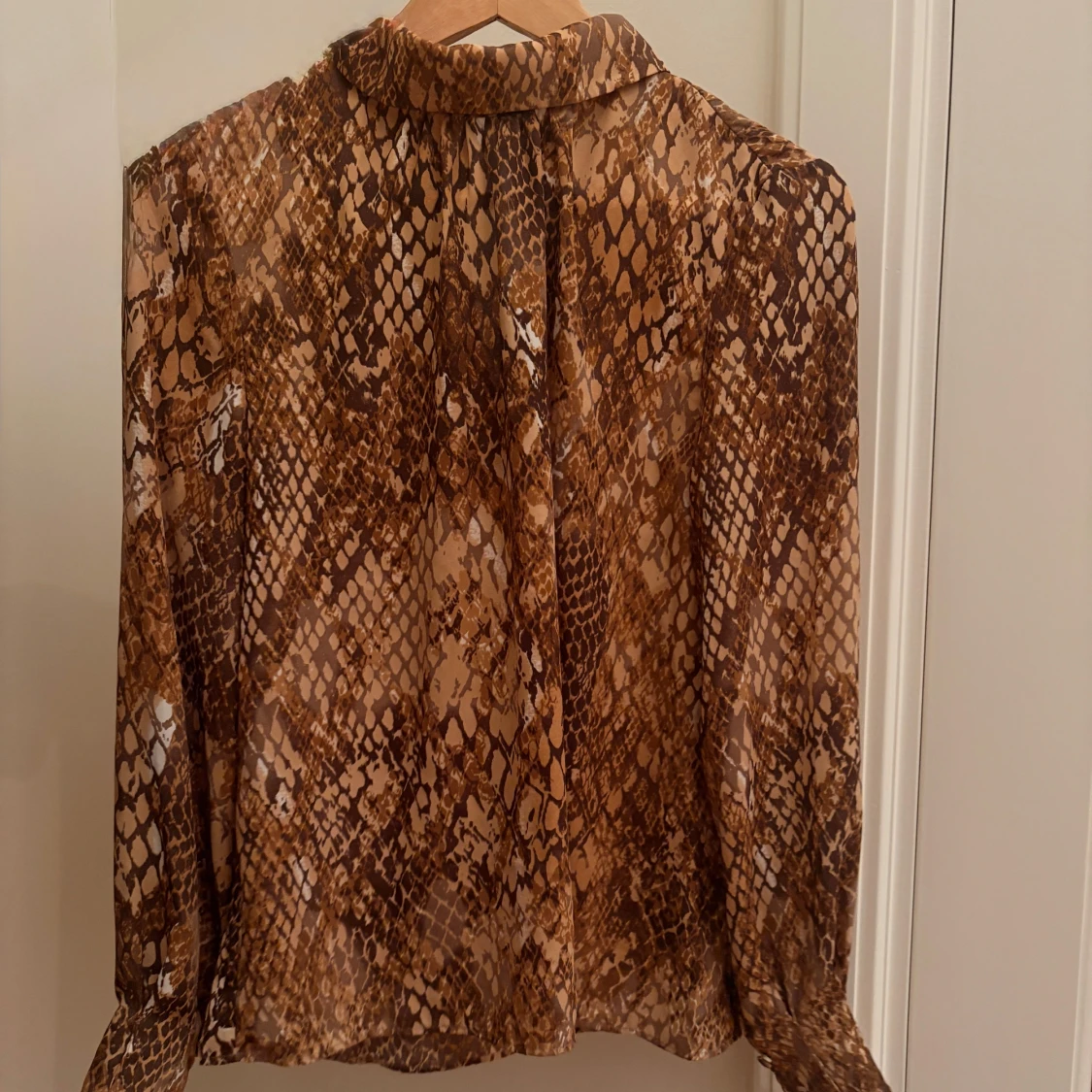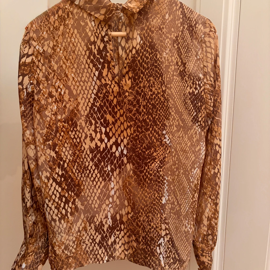 Säljer en snygg långärmad skjorta i brunt och beige med coolt ormmönster. Skjortan har en lös passform och är tillverkad i ett lätt, transparent material som ger en trendig vibe. Perfekt för dig som vill sticka ut med en unik look. Den har en knapp i ryggen också.