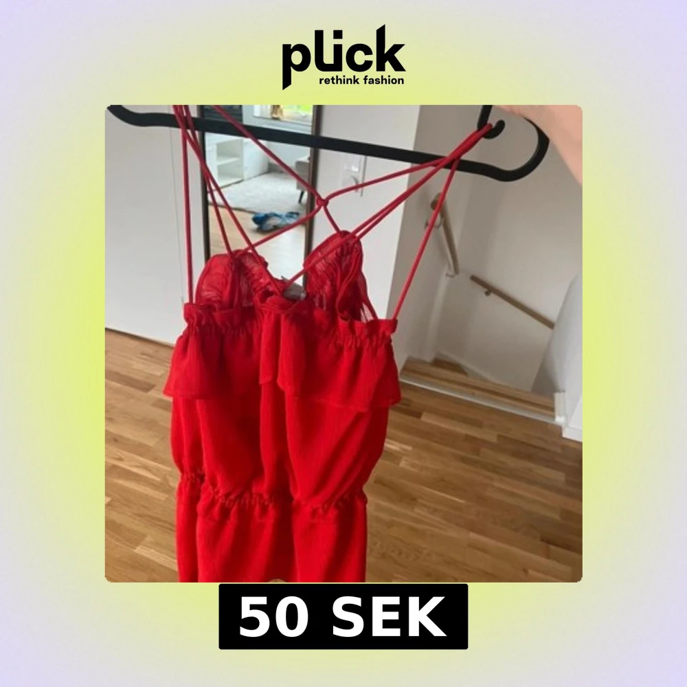 Säljer en röd axelbandslös topp med smala axelband och volang upptill. Klänningen har resår i midjan för en bekväm passform och är perfekt för sommarens tillfällen. Snygg och trendig modell med fina detaljer.