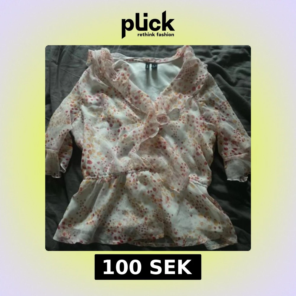 Säljer en söt och luftig omlottblus från H&M med volangdetaljer och v-ringning. Blusen är vit med prickigt mönster i rosa, rött och gult, har trekvartsärm och är gjord i ett tunt, transparent material som känns riktigt somrigt.