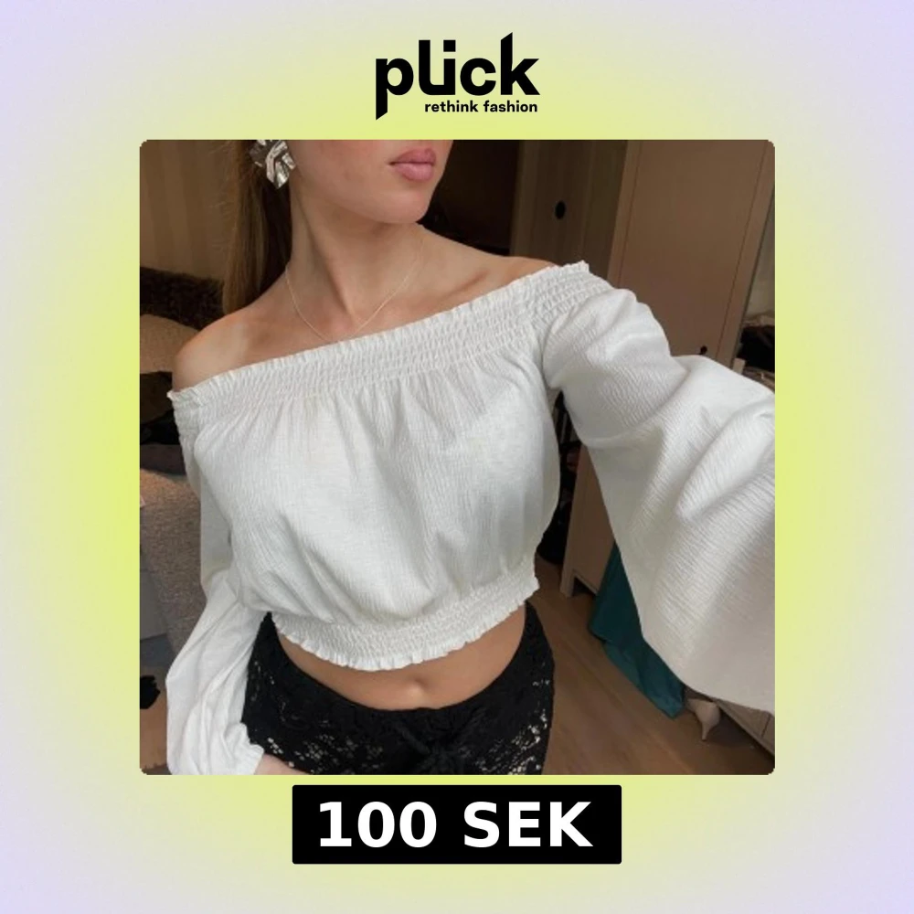 Säljer en vit croppad blus med offshoulder och långa puffiga ärmar. Toppen har smockdetaljer upptill och nertill som ger en snygg passform. Perfekt för dig som gillar en romantisk och trendig stil.