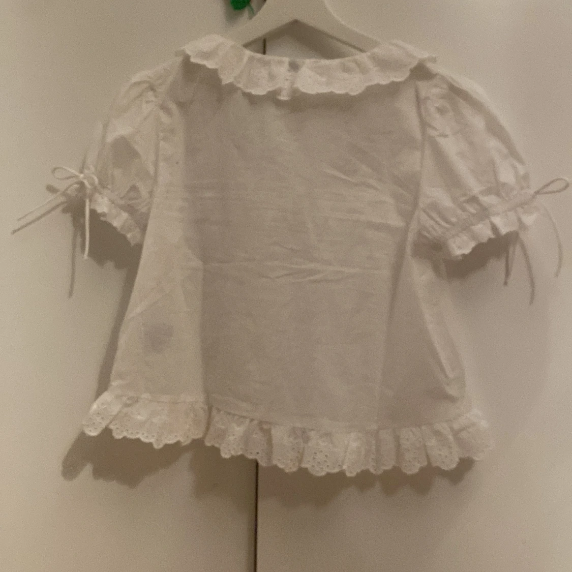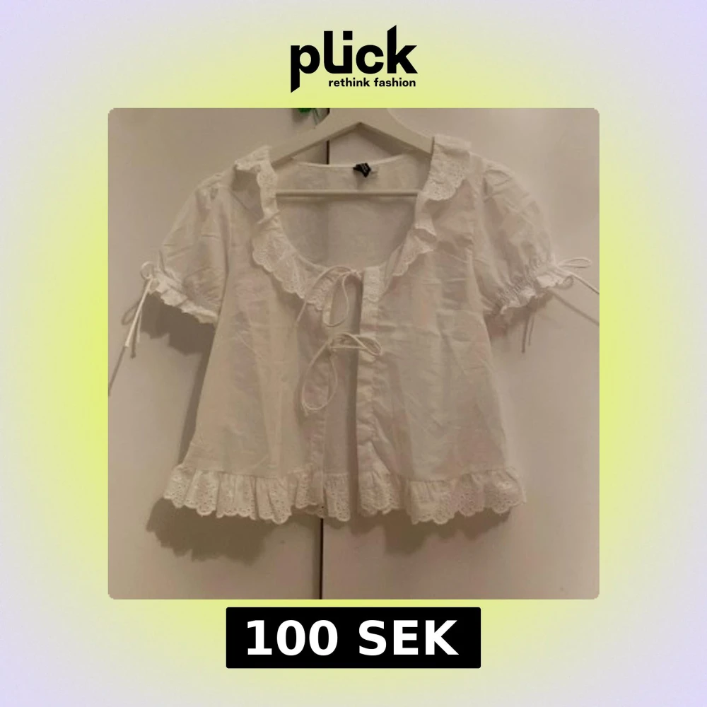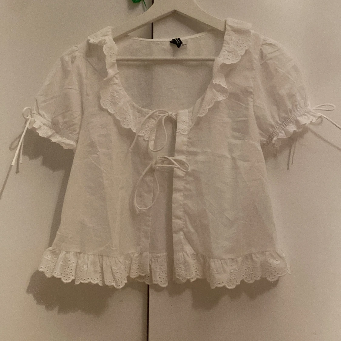 Söt vit blus med korta puffärmar, knytning framtill och dekorativa spetsdetaljer längs krage, ärmslut och nederkant. Volangkant ger en romantisk känsla. Perfekt för sommarens alla tillfällen.