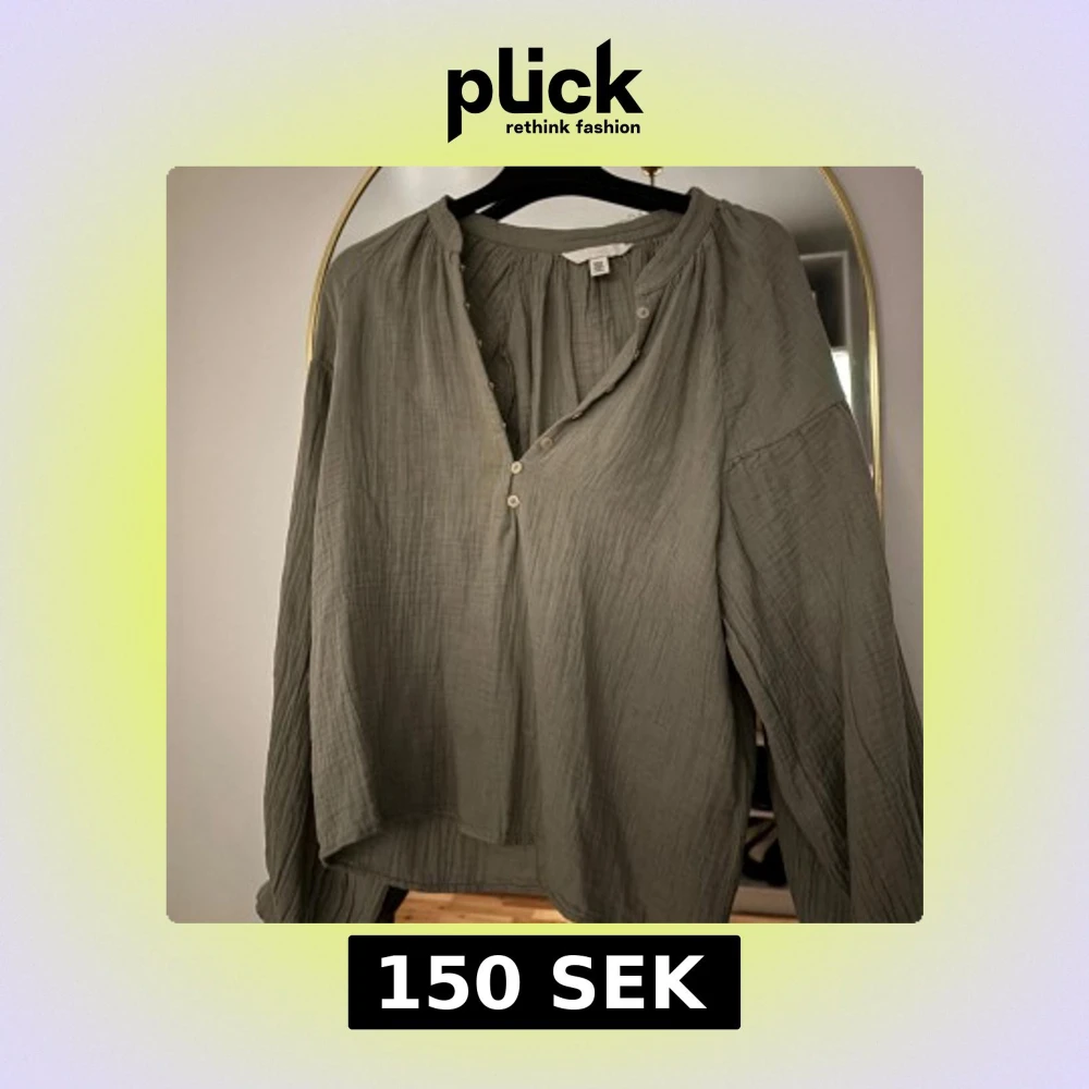 Säljer en söt grön blus från H&M i mjuk, krinklad bomull. Skjortan har v-ringning med knappar, långa ärmar med resår vid ärmslut och en loose fit. Storlek Xs, använd fåtal gånger, finns ej att köpa längre. Skriv för fler frågor/ bilder! 🩷