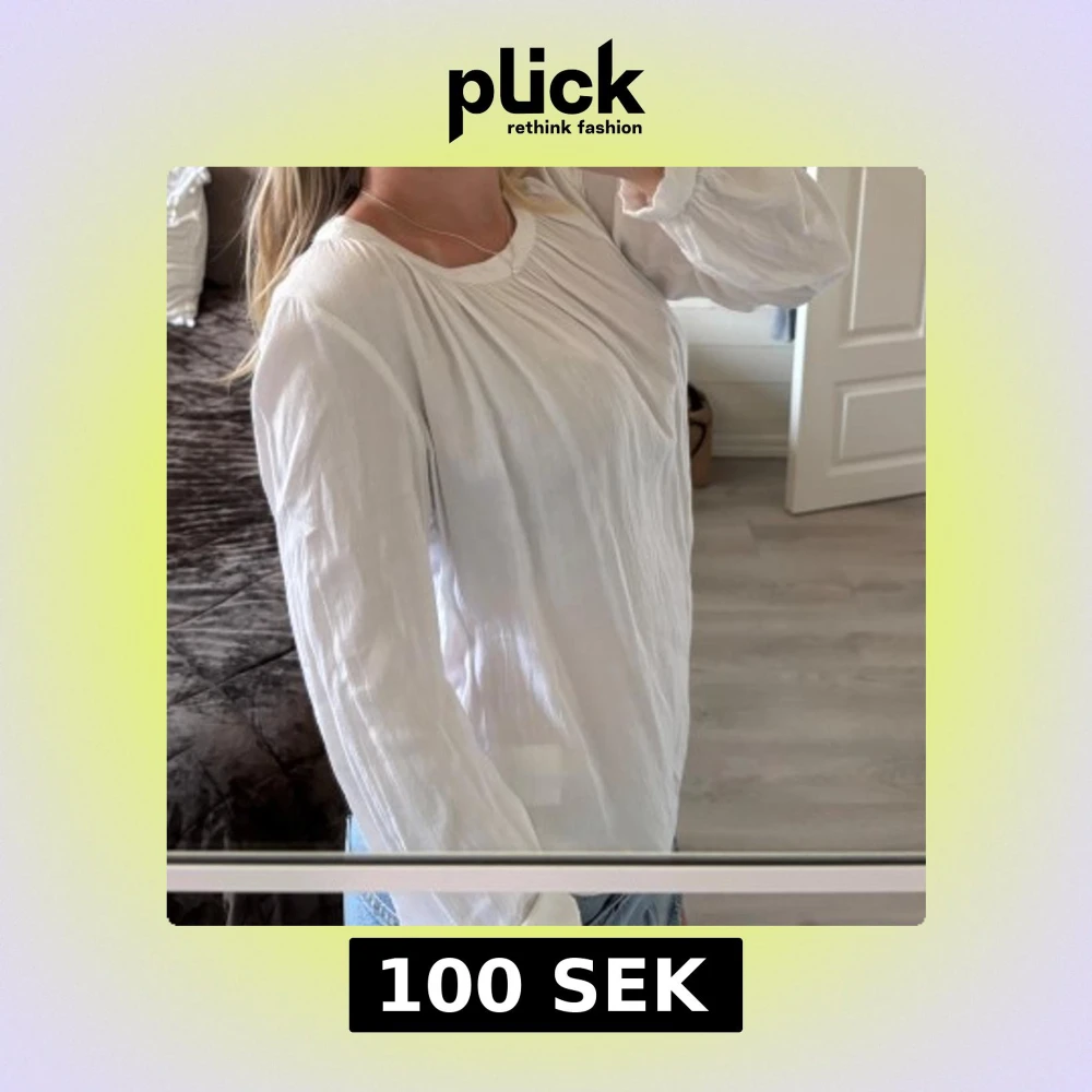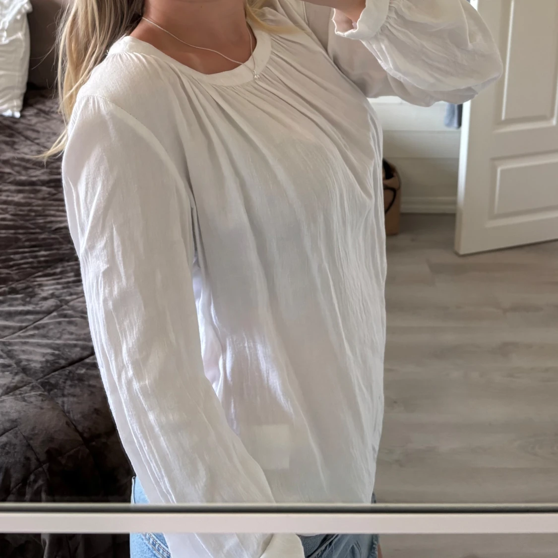 Säljer en vit blus med rynkade detaljer vid halsringningen och långa, luftiga ärmar. Blusen har en avslappnad passform och är gjord i ett tunt, mjukt material som känns skönt mot huden. Perfekt att matcha med jeans för en fräsch look💕