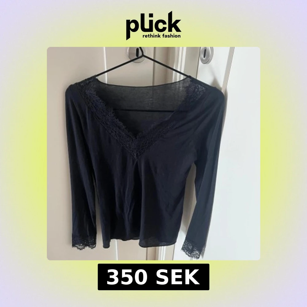 Populär svart tröja från Intimissimi med v-ringning och spetsdetaljer vid hals och ärm. Endast använd två tre gånger och tvättad en gång så myckey bra skick, jag anser att den är som ny!