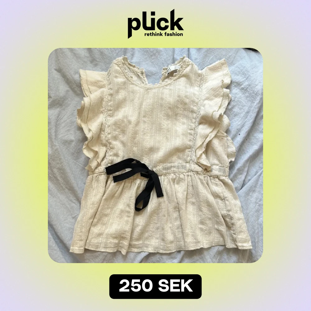 Charmig beige blus från Anthropologie (Zara) i storlek S. Den har vackra volangdetaljer längs ärmarna och en söt knytning i midjan. Perfekt för vår och sommar, med en romantisk och luftig stil. Blusen är i mycket bra skick och redo för nya äventyr!
