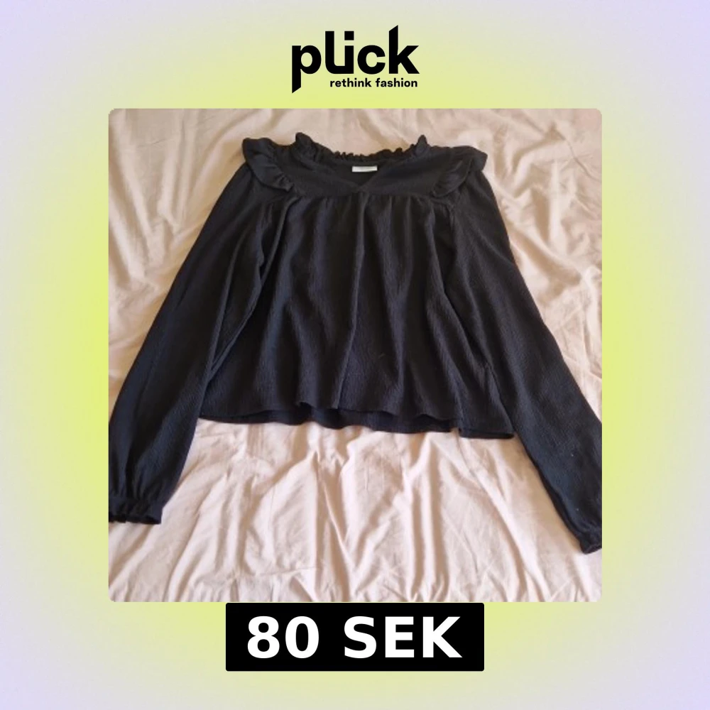Svart blus från Kappahl i storlek 146/152. Blusen har långärmade ärmar, volangdetaljer vid axlar och halsringning samt en lätt rynkad struktur i tyget. Perfekt för dig som gillar en enkel men ändå söt stil. Materialet känns mjukt och har en lätt struktur.