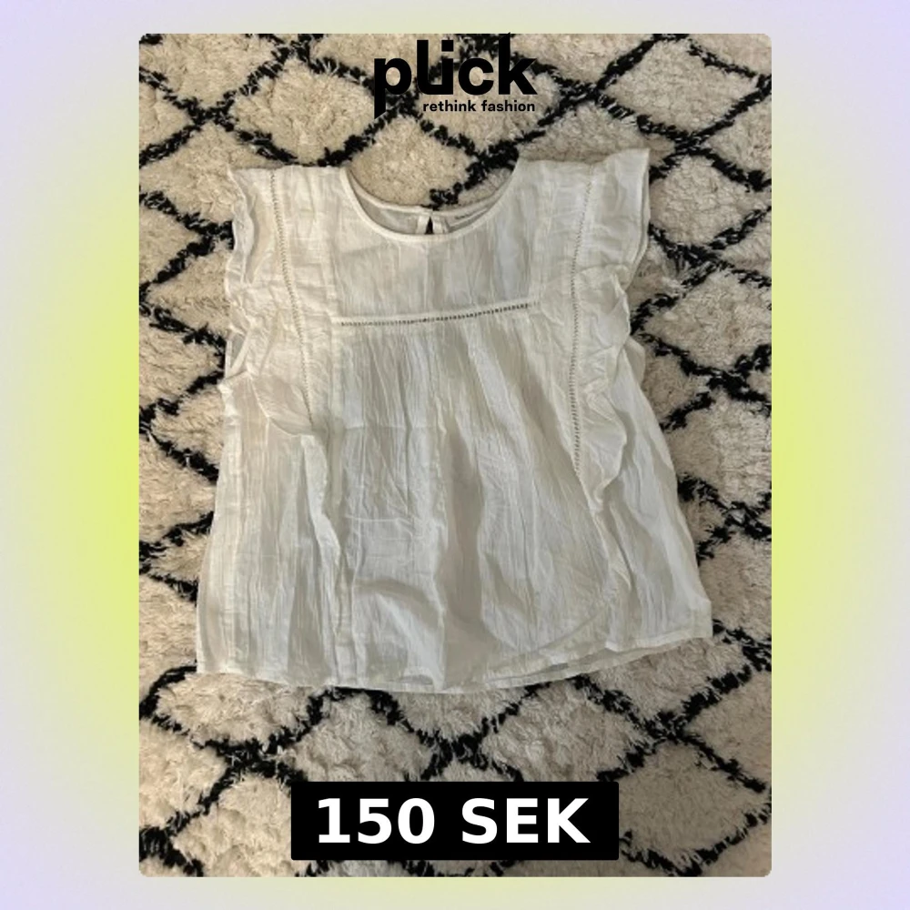 Säljer en söt vit blus från Kappahl i storlek 158. Blusen har volangdetaljer längs axlarna och fina broderade sömmar framtill. Den är gjord i ett lätt och luftigt bomullstyg, perfekt för varma dagar. Rund halsringning och ärmlös design ger en fräsch och stilren look.