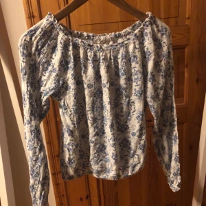 Blusen har blivit för liten och därför säljer jag den:) Det är en vit blus med blåa blommor, ganska kort modell, går att ha off shoulder med resår i ovan- och nederkanten och i slutet av ärmarna. Mjuk viskos-crêpe.