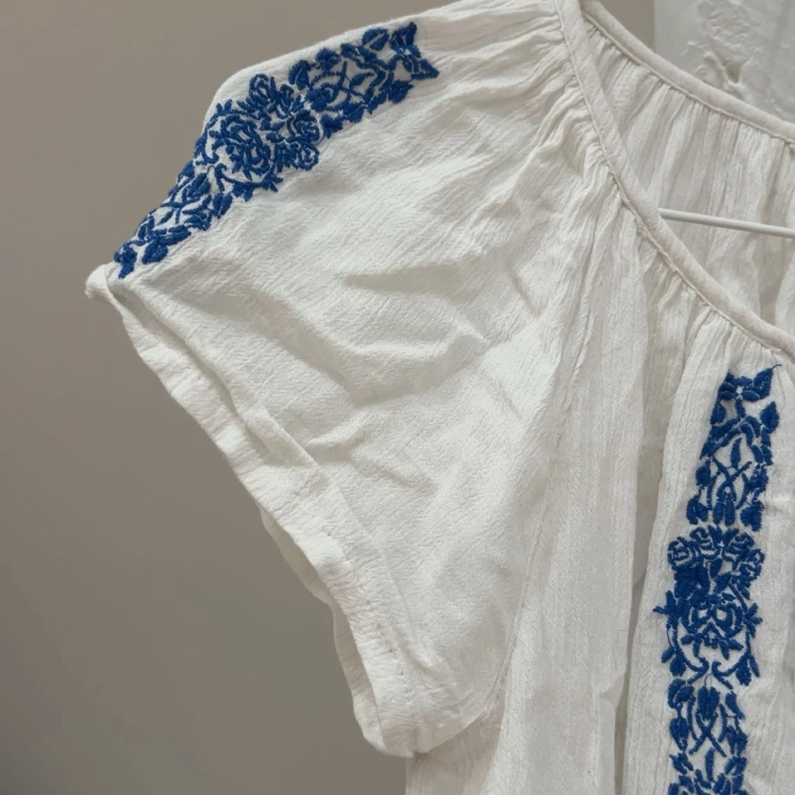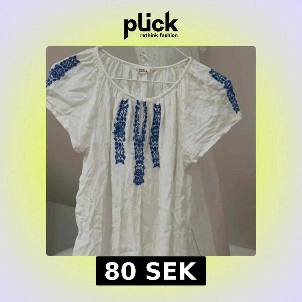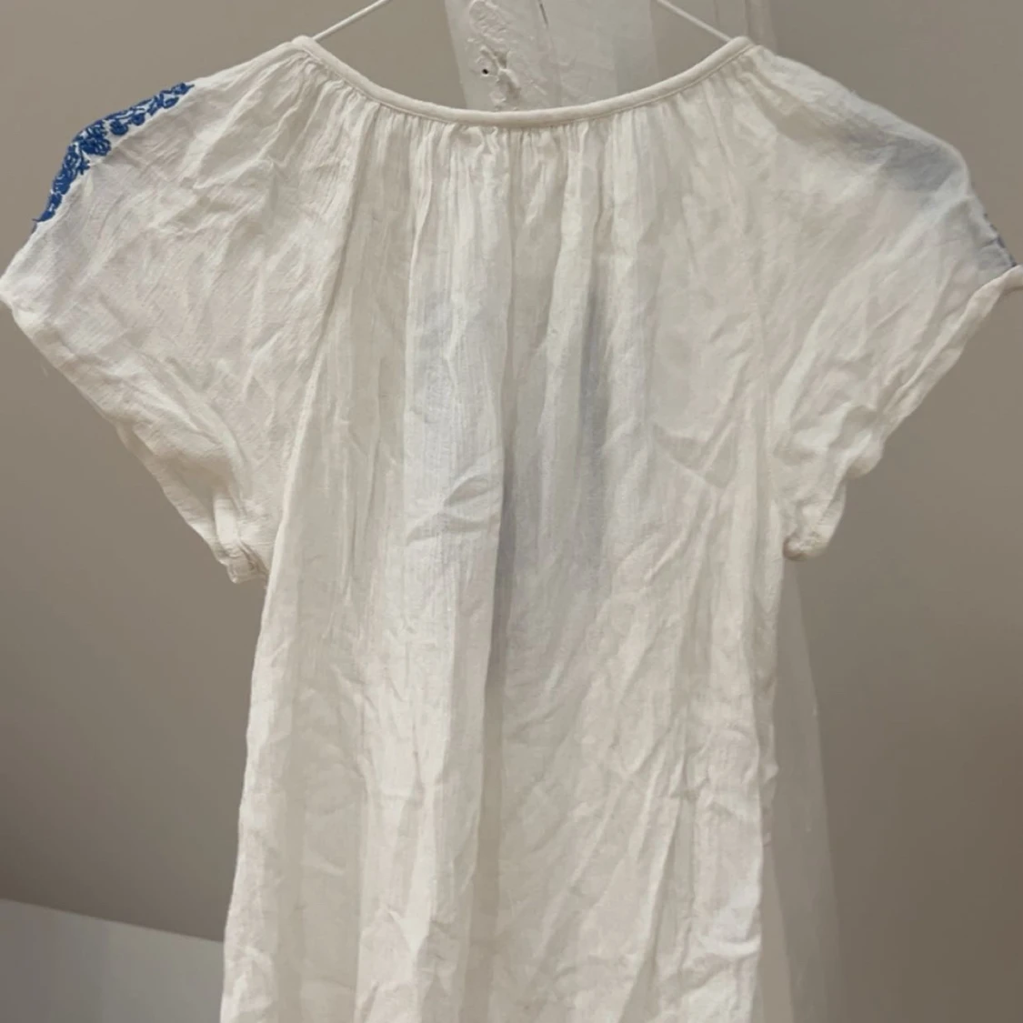 Superfin vit blus med blått broderat blommönster på axlar och framtill💙Blusen har korta ärmar, rund halsringning och en liten knapp framtill. Storlek 170 men passar mig som vanligtvis bär xs-s perfekt. Den har en ytterst liten fläck som knappt syns (sista bilden), men den tvättar jag bort vid försäljning. Nästan helt oanvänd så är i jättebra skick annars🌸