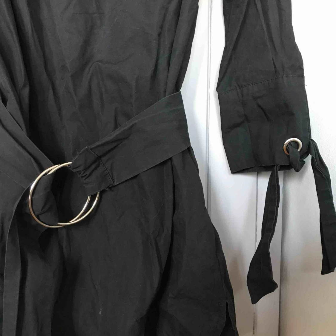 Cool svart krispig blus i linneaktigt tyg, ska vara off shoulder och knyt i midjan