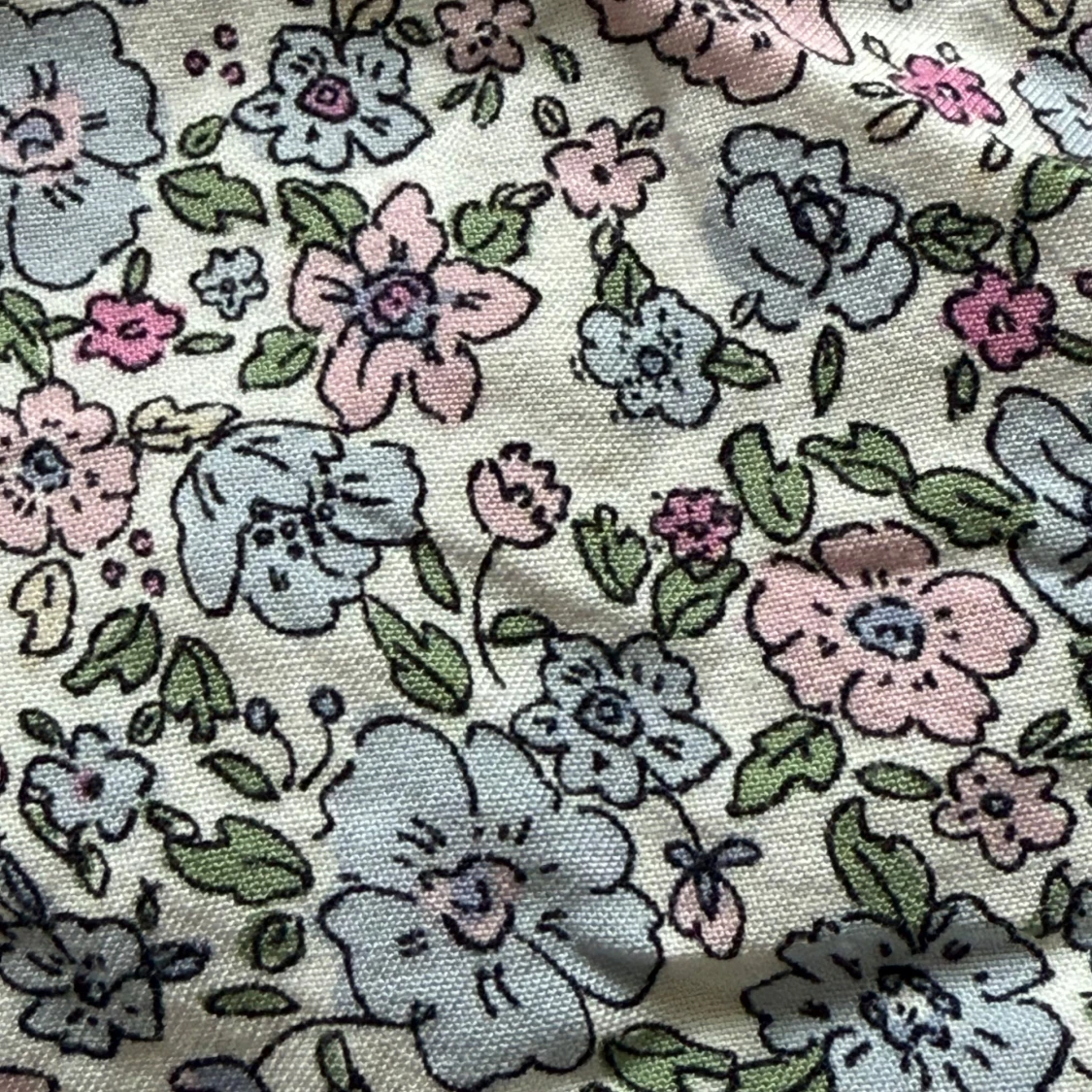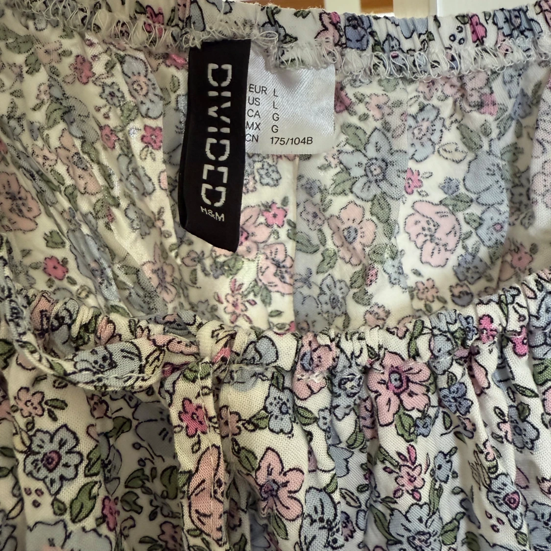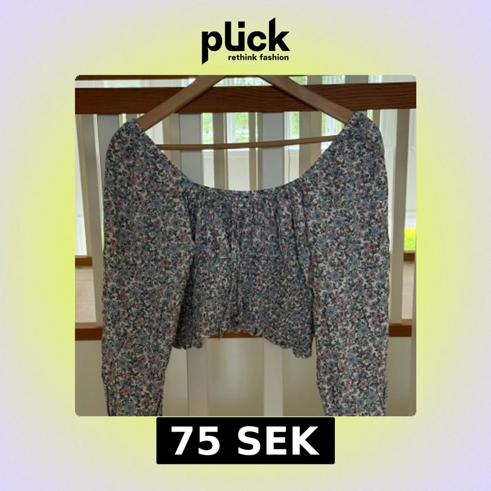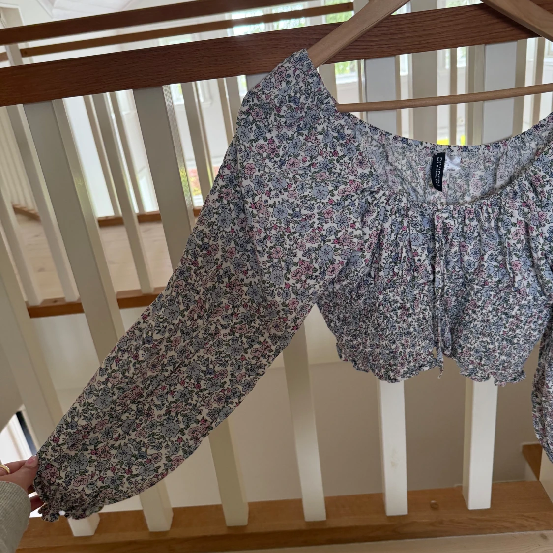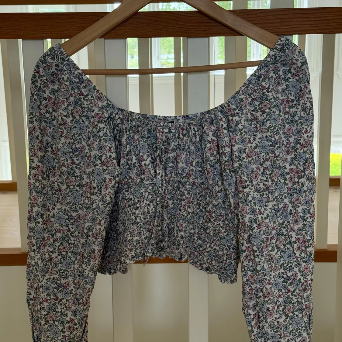 Supersöt blommig blus från H&M Divided med croppad passform och långa ärmar. Toppen har smockad midja, volangkant och offshoulder-ringning. Mönstret är i pastelliga toner av blått, rosa och grönt på vit botten. Perfekt för vår och sommar!
