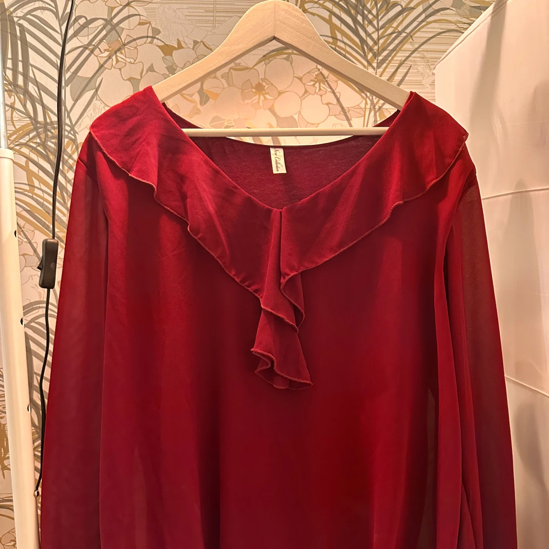 Röd blus med v-ringning och volang.