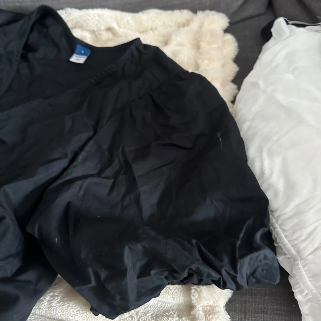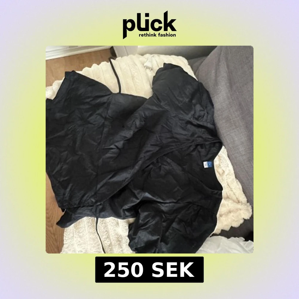 Svart omlott blus från Old Navy med puffiga korta ärmar och knytband i midjan. Blusen har en v-ringad hals och är tillverkad i ett lätt, vävt material som ger en snygg siluett. Perfekt för dig som gillar stilrena och enkla plagg. Köpt i usa