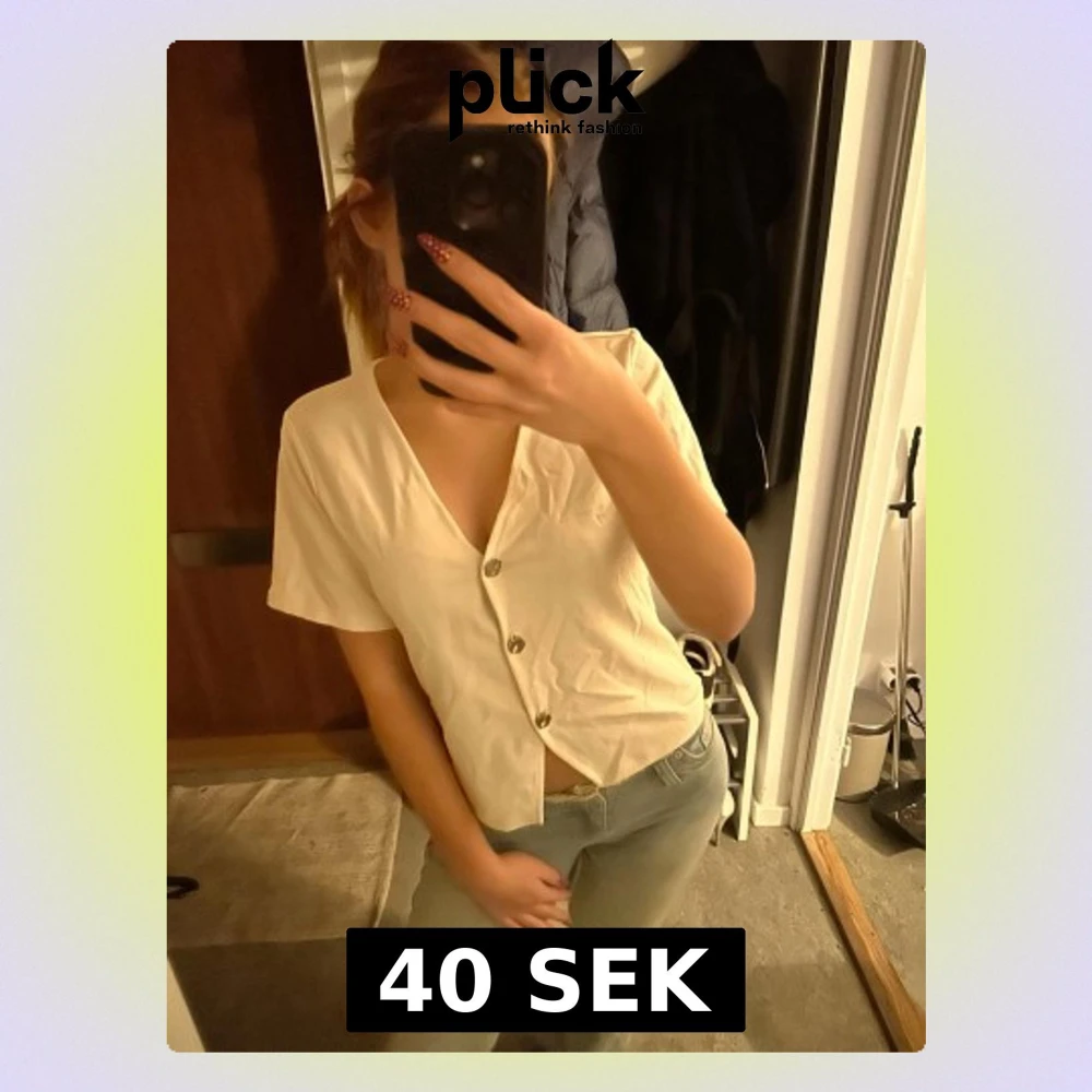 Säljer en stilren vit topp med v-ringning och korta ärmar. Toppen har en avslappnad passform och knäpps med tre synliga knappar framtill. Perfekt till jeans eller kjol för en enkel och fräsch look.
