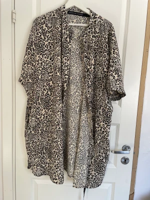 Tunika/blus i leopardfärg. Svalt material, använd en gång för att dölja gravidmage på konsert. Storlek L skulle jag säga, oversized.