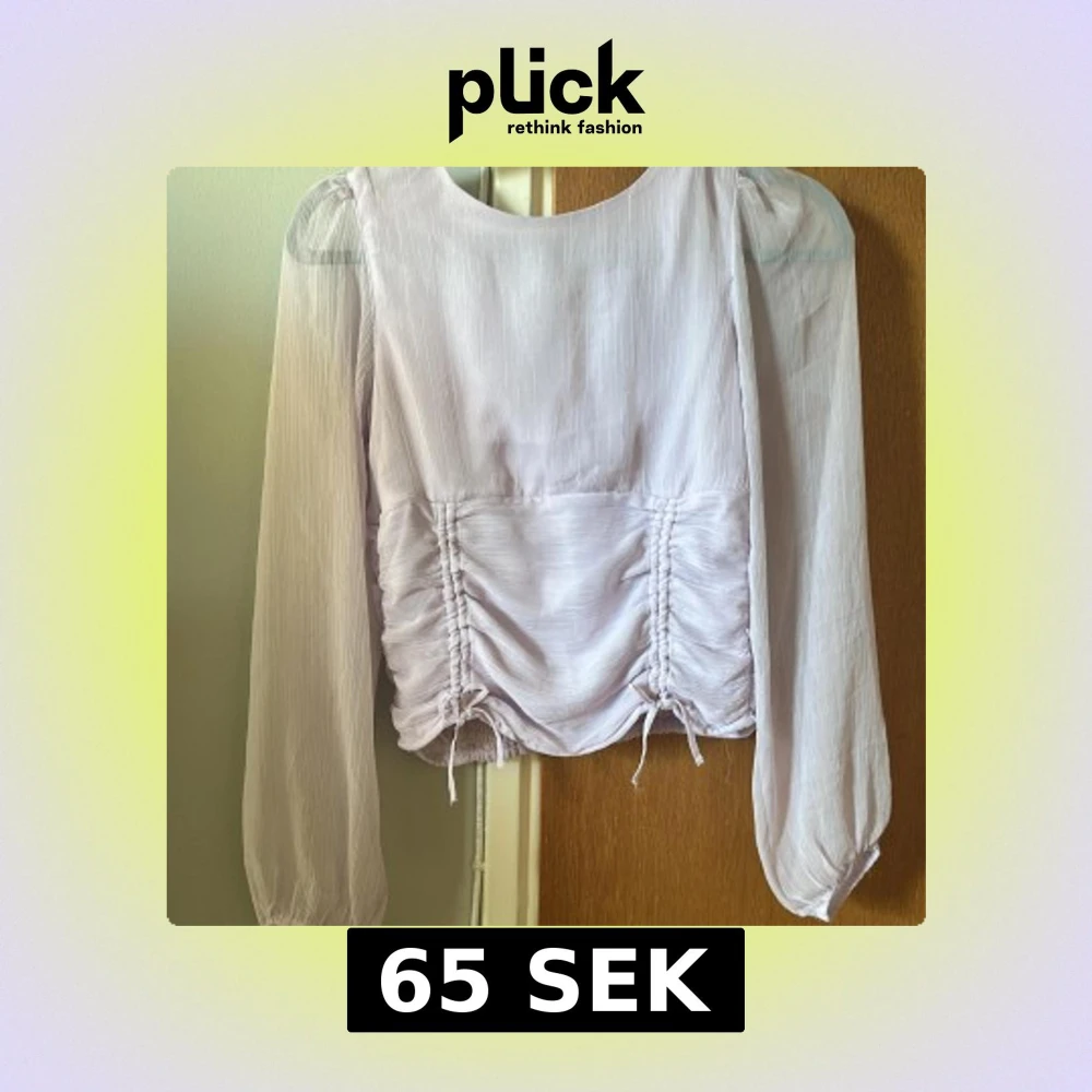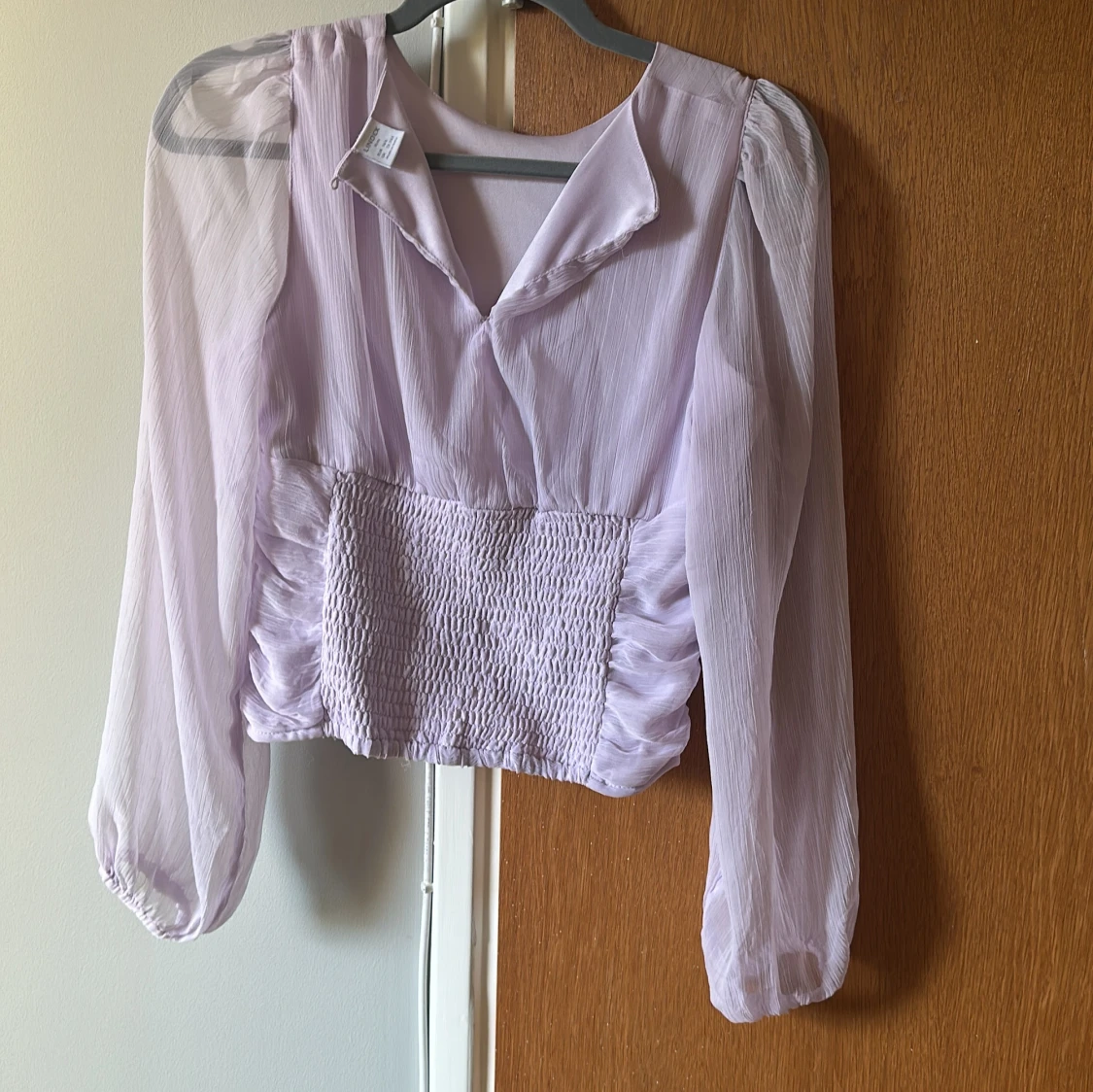 Superfin ljuslila blus med transparenta puffärmar och snygg snörningsdetalj framtill. Blusen har smockad rygg. Blusen är tajt i midjan och vid ryggen och lösare upptill.