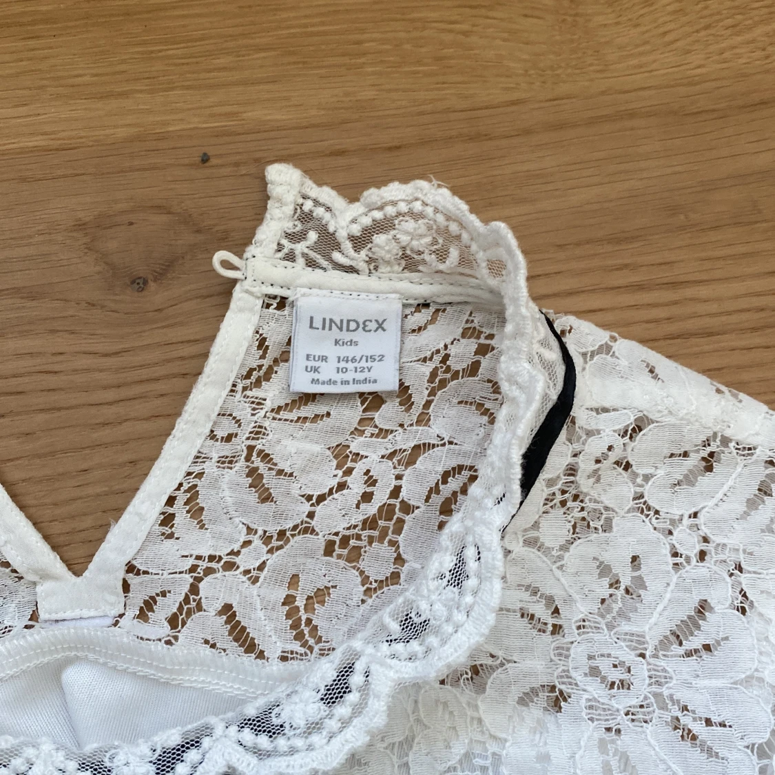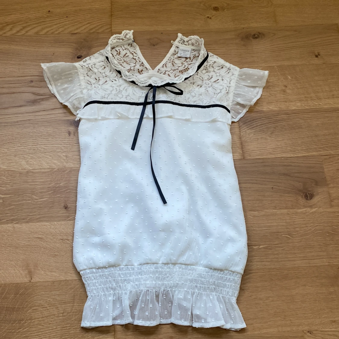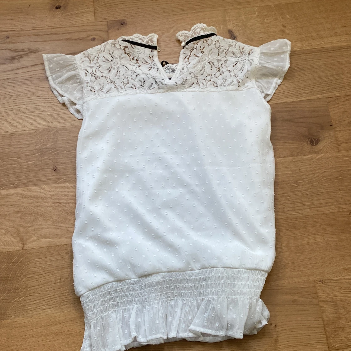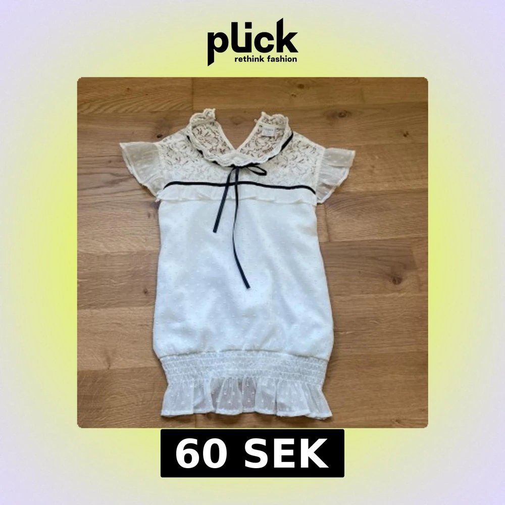 Säljer en söt vit blus från Lindex med spetsdetaljer och en liten rosett vid halsen. Blusen har korta ärmar och en volangkant . Perfekt till sommaren