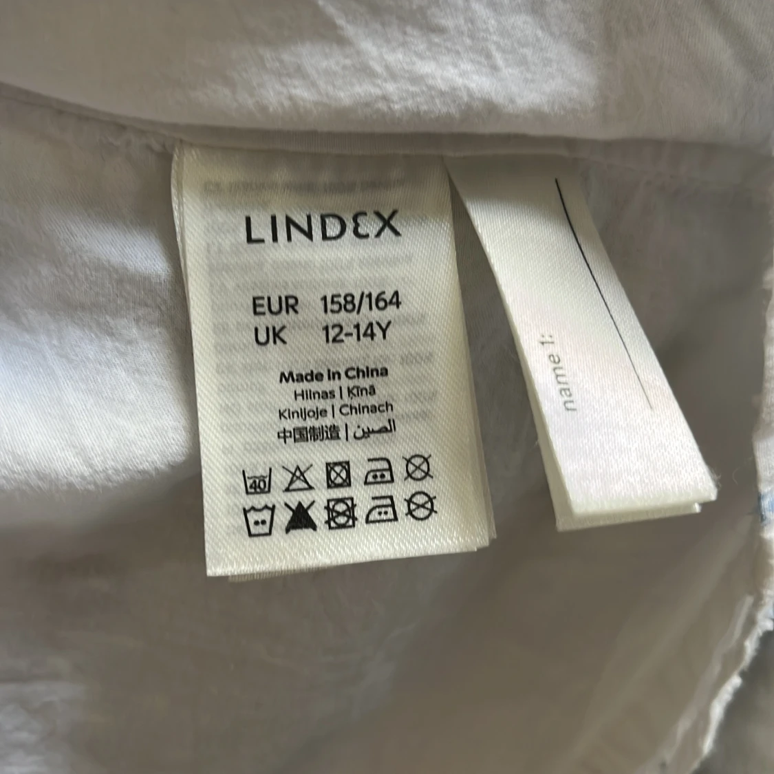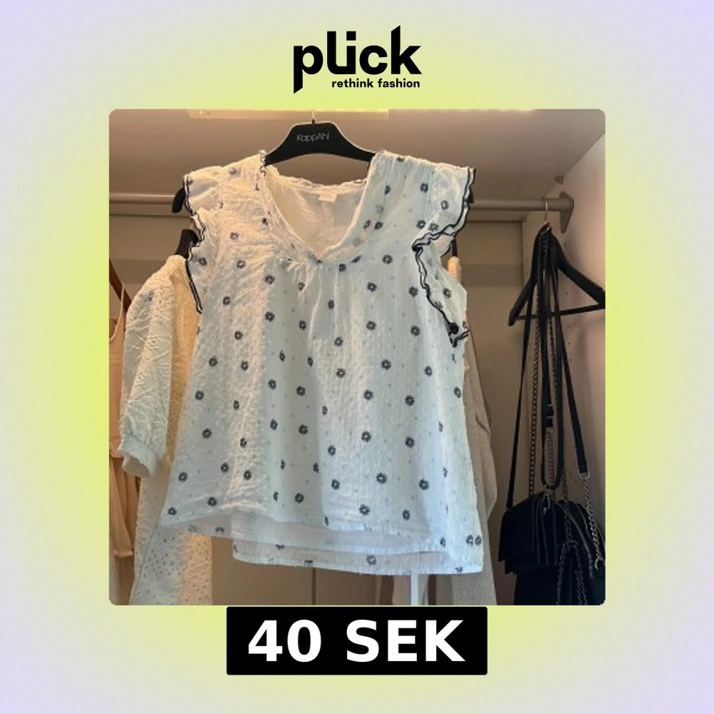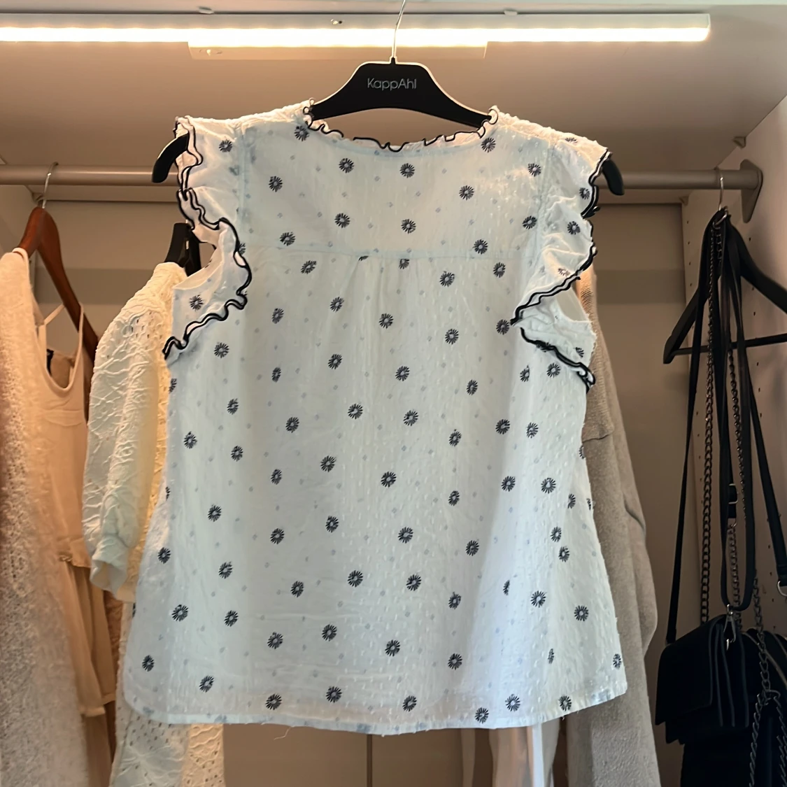 Supersöt vit blus från Lindex med små mörkblå blommor och volangdetaljer vid ärmhålen. Blusen är ärmlös med v-ringning och har svarta vågiga kanter på volangerna. Perfekt för en fräsch och somrig look!