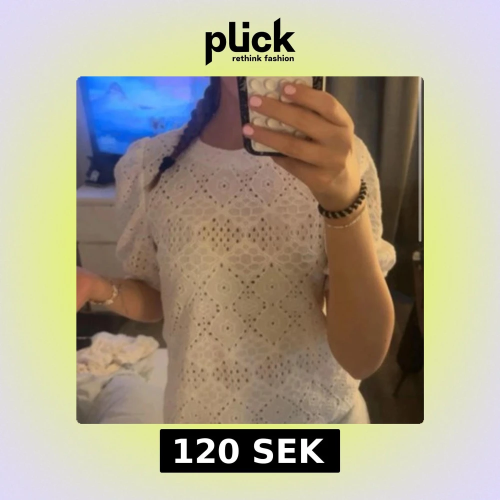 Superfin vit blus med puffiga korta ärmar och broderade spetsdetaljer i ett geometriskt mönster. Blusen har rund hals och är tillverkad i ett luftigt bomullstyg med hålmönster. Perfekt för dig som gillar romantisk och feminin stil.