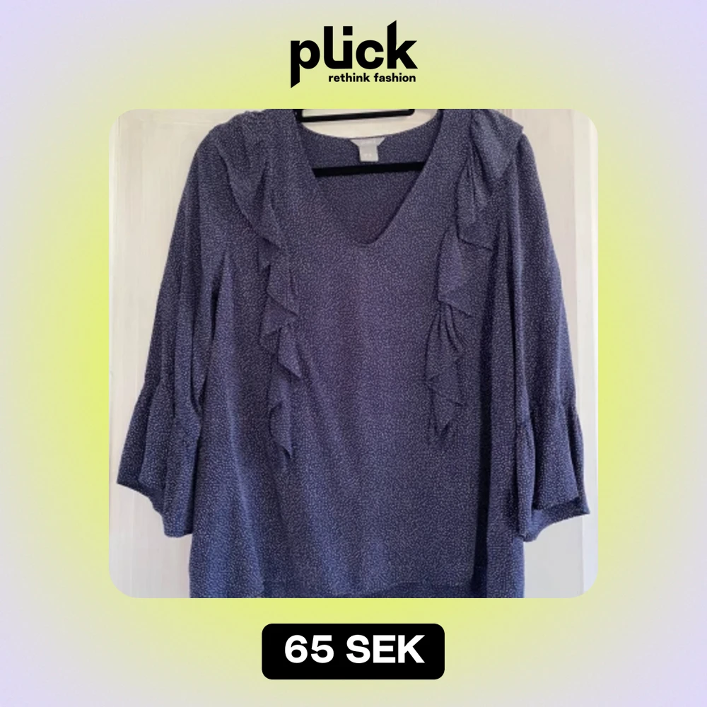 Söt blus med volanger, tyget är marinblått med små vita prickar. Superfina vida trekvartsärmar. Snygg till jeans! Mycket gott skick, knappt använd.