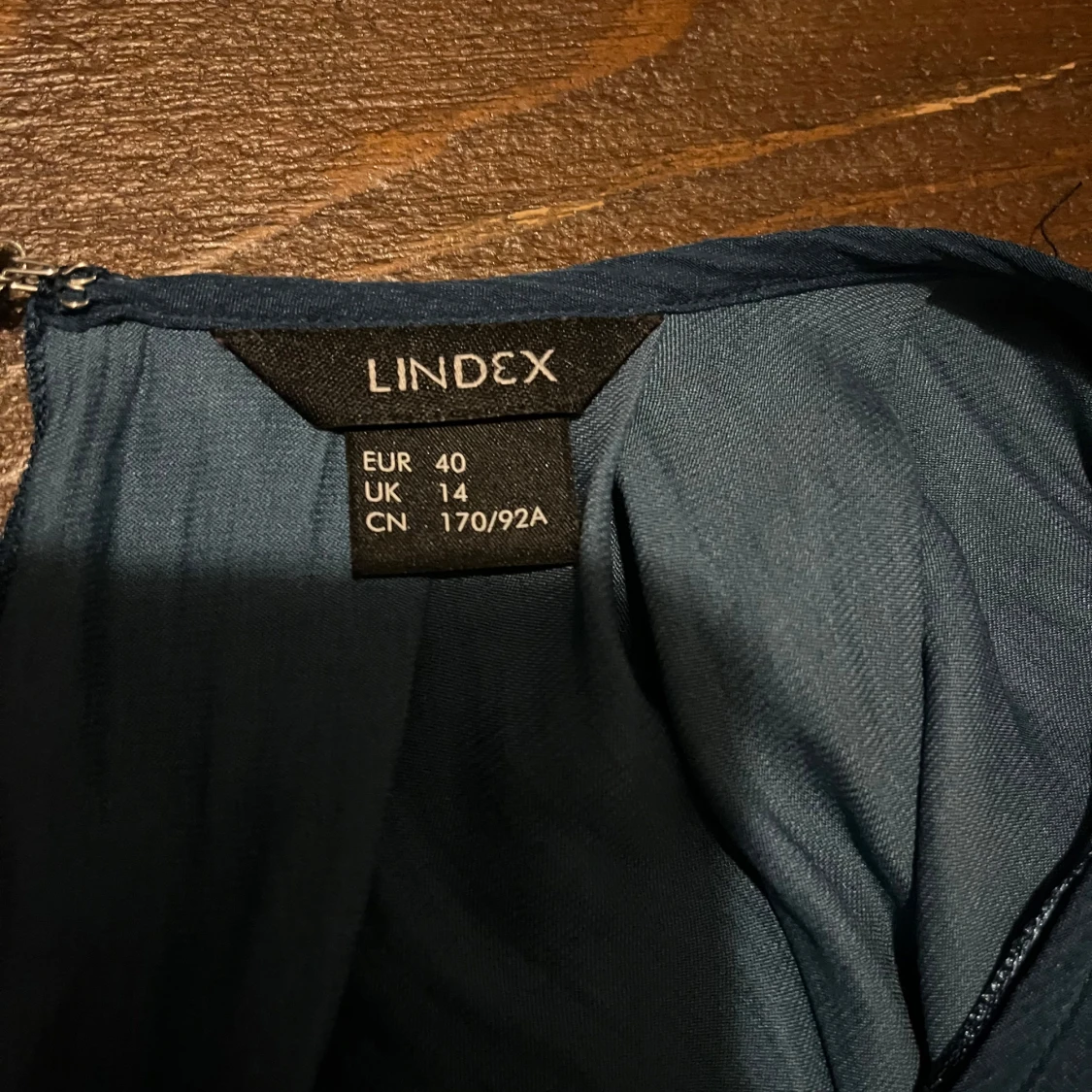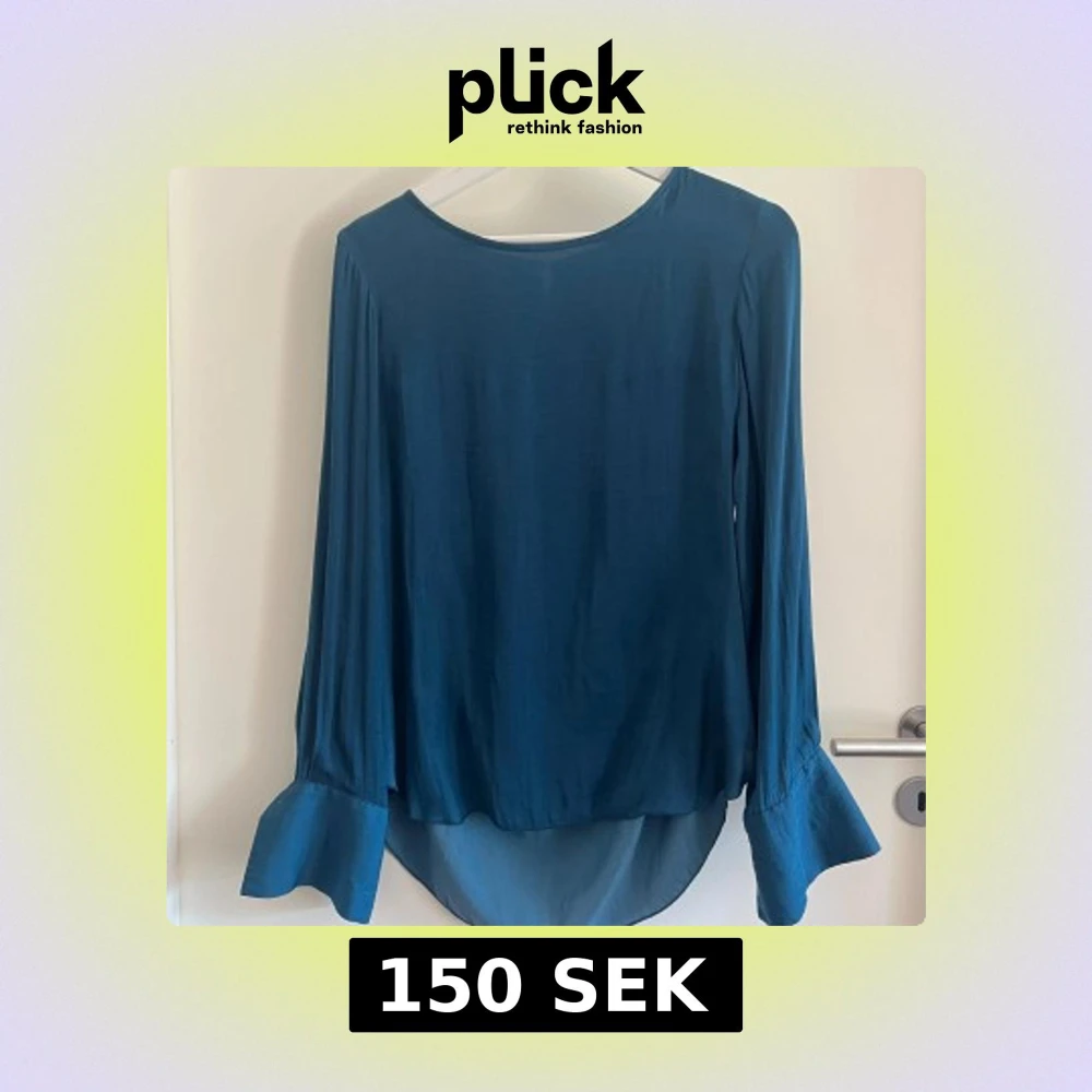 Blå blus från Lindex i storlek 40. Blusen har rund halsringning, långa ärmar med breda manschetter och en lätt glansig yta. Baksidan har ett litet knappslå och tyget faller mjukt och elegant.