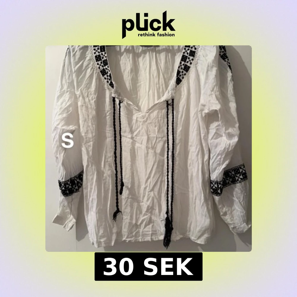 Vit långärmad blus med svart broderi på krage och ärmslut. Skjortan har v-ringning och långa svarta snören framtill. Luftig passform och tillverkad i bomull, perfekt för en avslappnad och trendig look.🌸 gulare under armhålorna. Storlek s