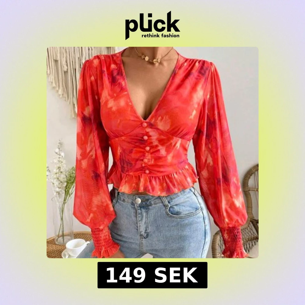 Superfin röd blus med blommigt mönster och v-ringning. Blusen har långa puffärmar med smock vid handlederna, knappar framtill och volangkant nedtill. Är i storlek M men passar även S