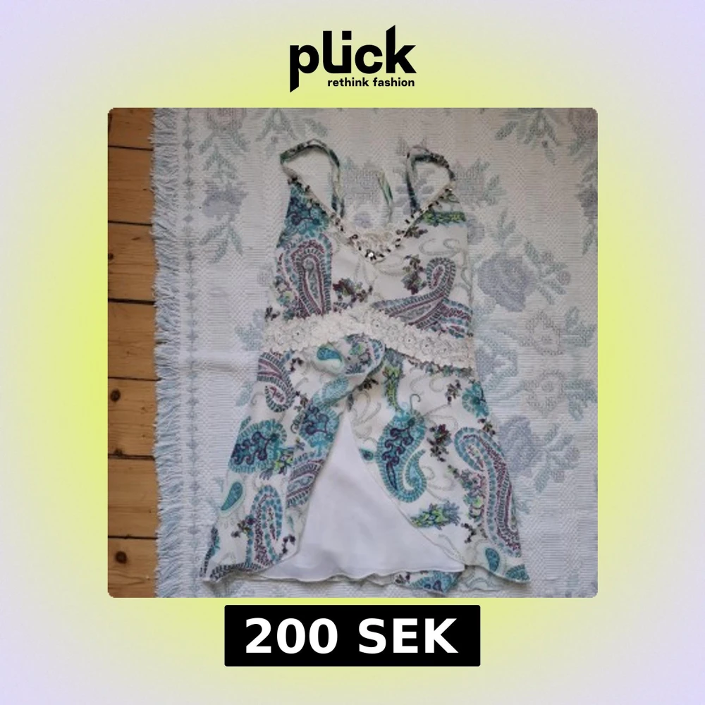 Säljer en vit kortklänning med paisleymönster i blått, lila och grönt. Klänningen har smala axelband, spetsdetalj i midjan och omlottkänsla framtill. Perfekt för varma dagar och har en feminin, bohemisk stil.