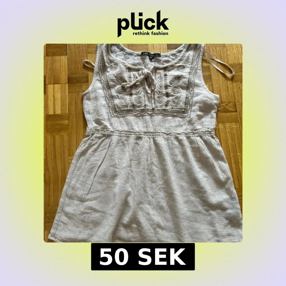 Supersöt beige kortklänning från Love Stitch med broderade blommor och blad framtill. Klänningen är ärmlös, har knytning vid halsen och är gjord i ett luftigt linnematerial. Perfekt för varma dagar när du vill känna dig både chill och snygg.