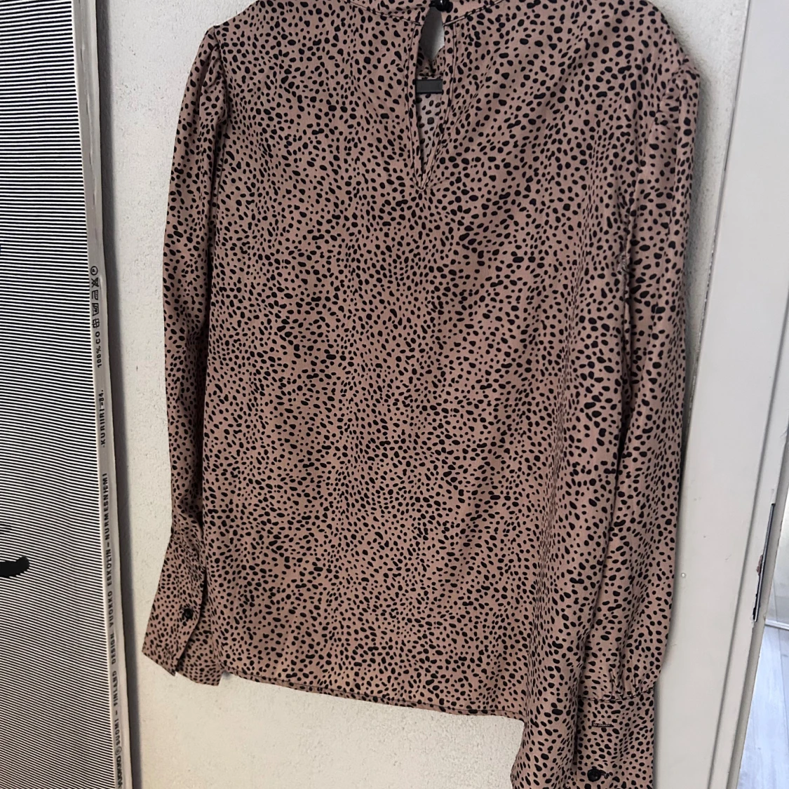 Säljer en beige blus med svarta prickar och långa ärmar. Blusen har en lite högre krage med voulang, knappar vid ärmslut och en rak passform. Perfekt för dig som gillar mönster och vill sticka ut lite extra.