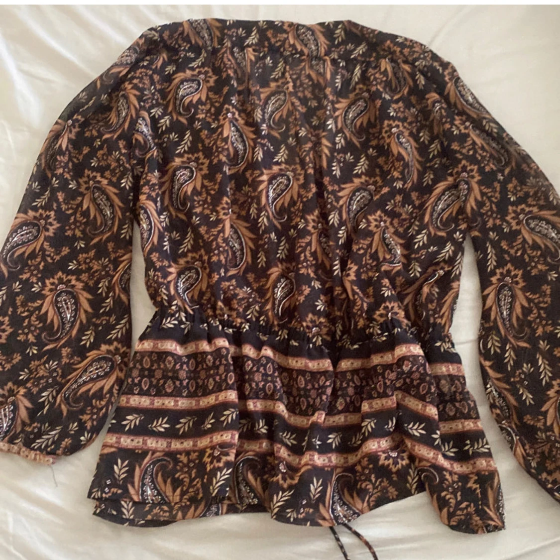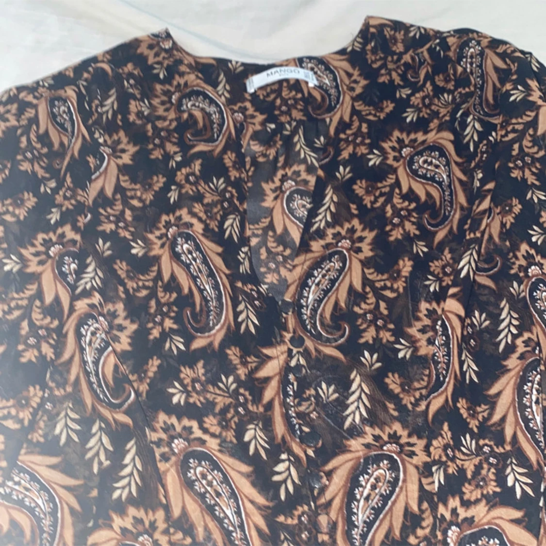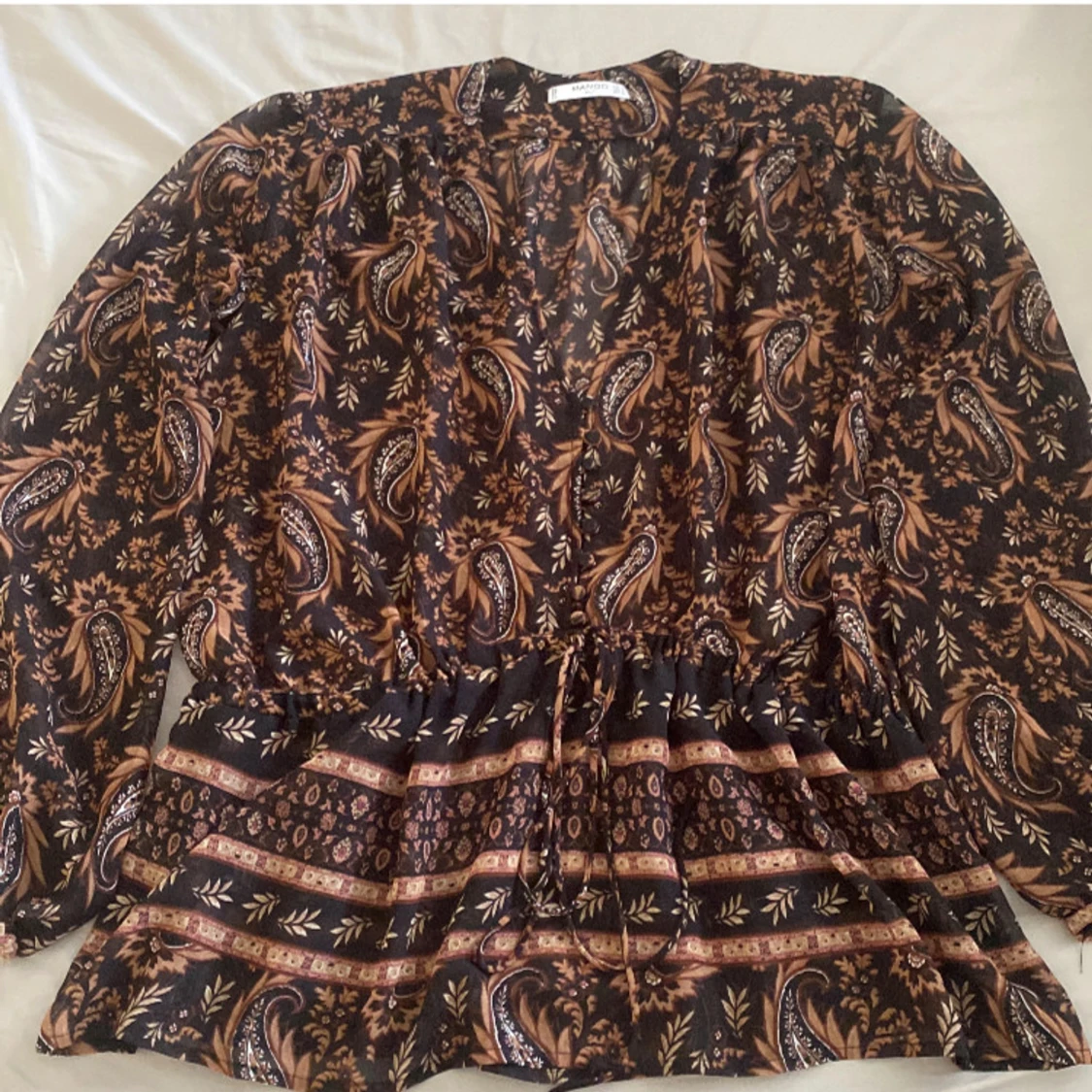jag säljer en jättefin lite genomskinlig blus från mango. tröjan är i storlek M och är v ringad på framsidan. tröjan är även väldigt luftig.