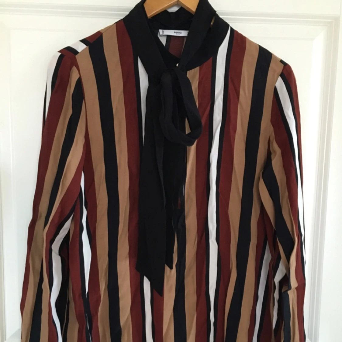 Snygg randig knytblus i svart, brunt, vitt och beige. Skön kvalitet, använd en gång. Dold knäppning fram, små diskreta guldknappar på manschetter och överst vid halsen.