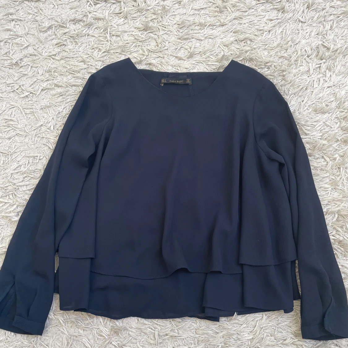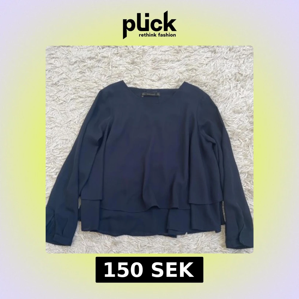 Säljer en stilren marinblå blus från Zara Basic i storlek S. Blusen har långa ärmar, rund halsringning och dubbla lager som ger en snygg, flowy look.