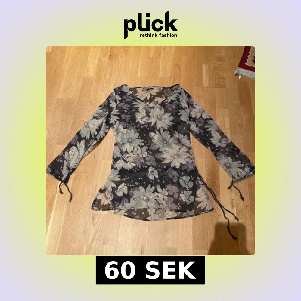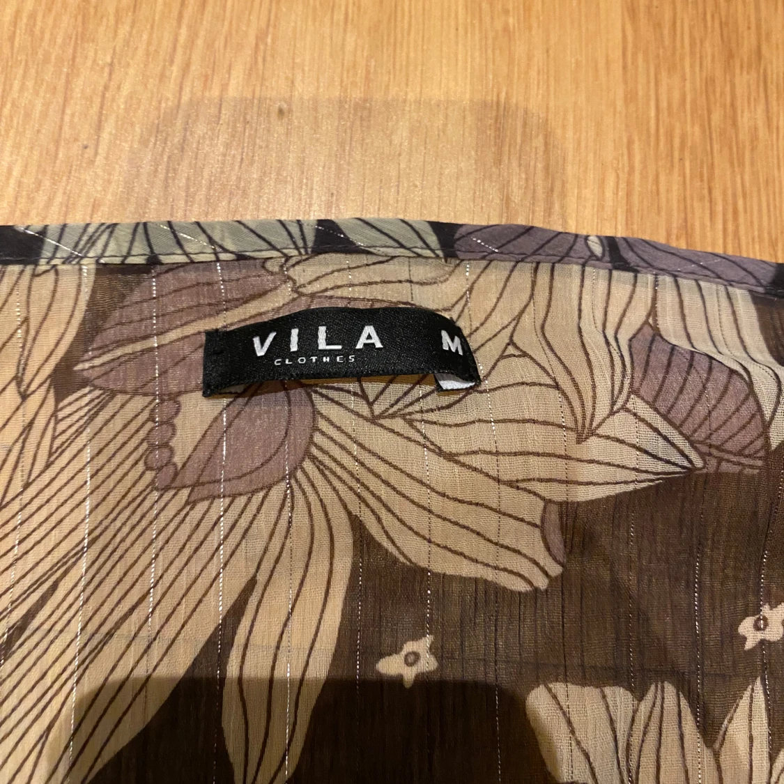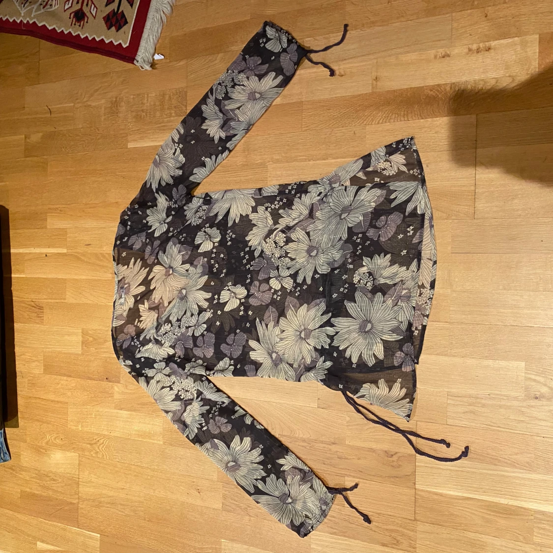 En semi genomskinlig blus från Vila med fint blom mönster och en liten knapp framtill, den äe justerbar i midjan och längst ut på ärmarna(ärmarna går typ lite förbi armbågarna) mycket bra skick!