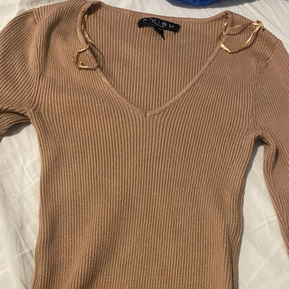 Säljer en beige ribbad tröja från Newyorker med v-ringning och långa ärmar. Tröjan har dekorativa guldfärgade detaljer vid axlarna och är figurnära i modellen. Har använt ett par gånger
