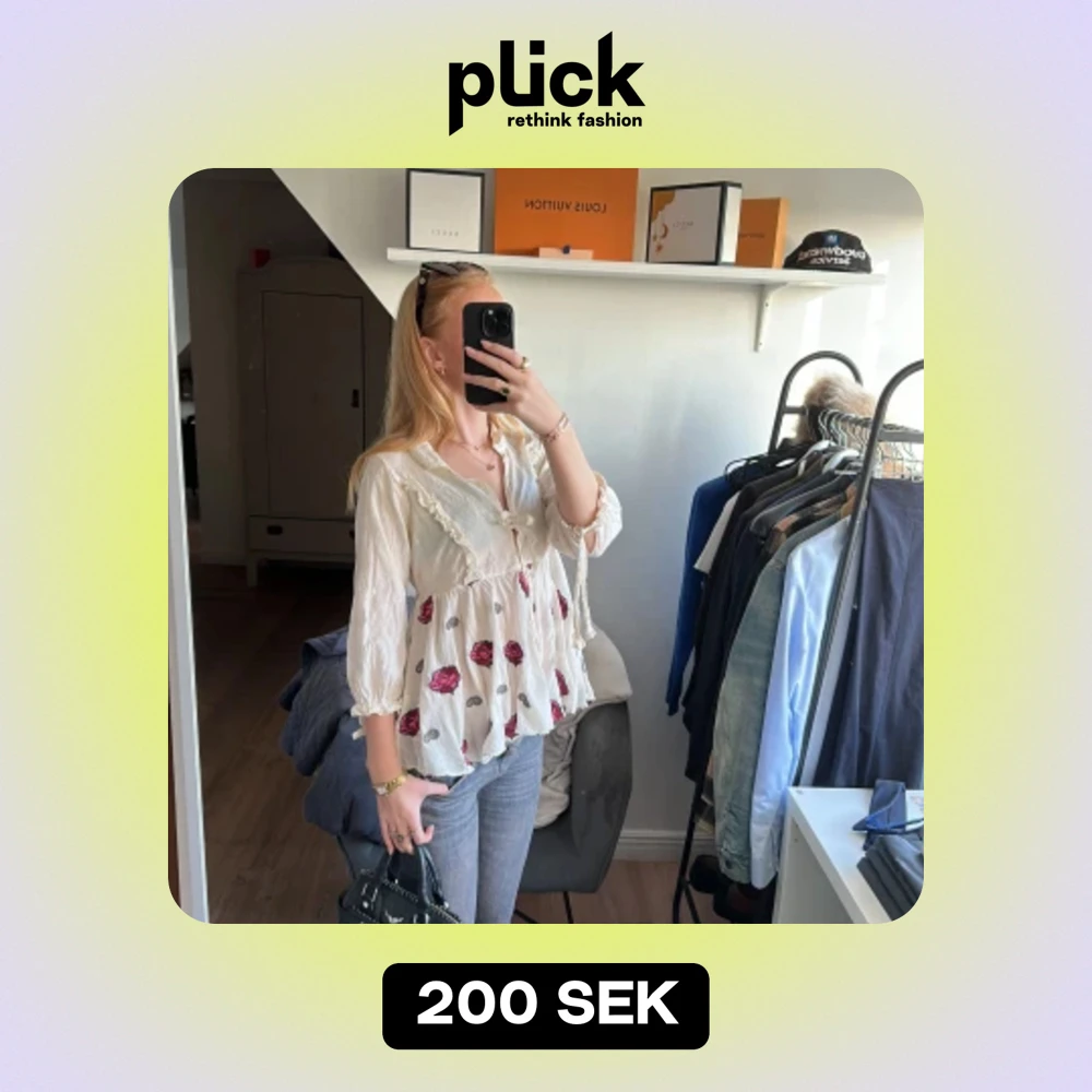 Lite äldre super söt blus från Odd Molly.😇Väldigt detaljerad med rosor, volanger och rosetter🎀 Finns knappar i princip hela vägen upp. Färgen är originellt benvit, alltså är den ej missfärgad😊Tunt material, perfekt till sommaren!😻💕