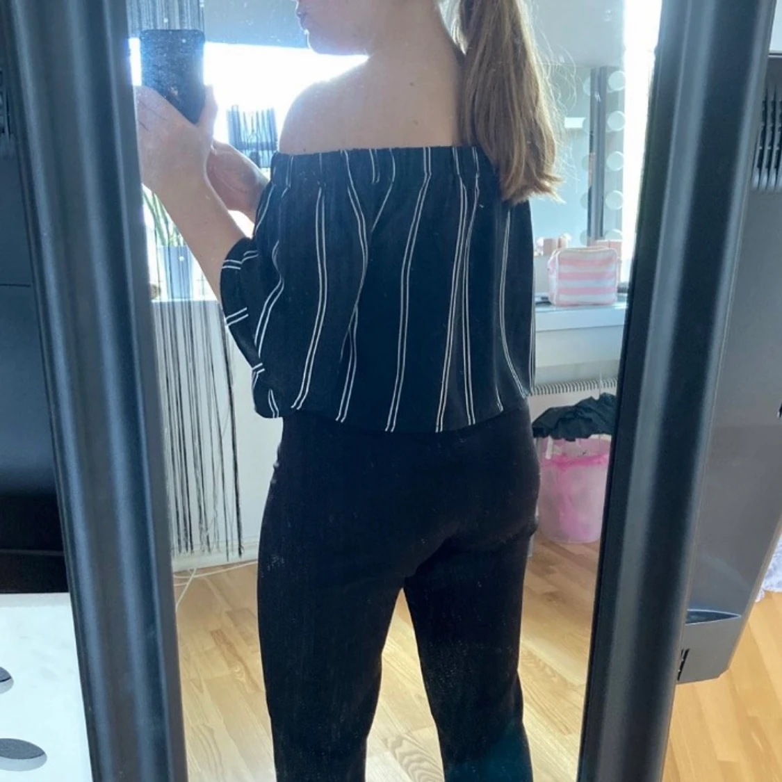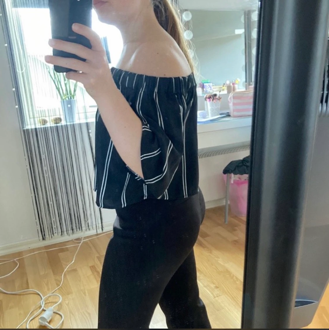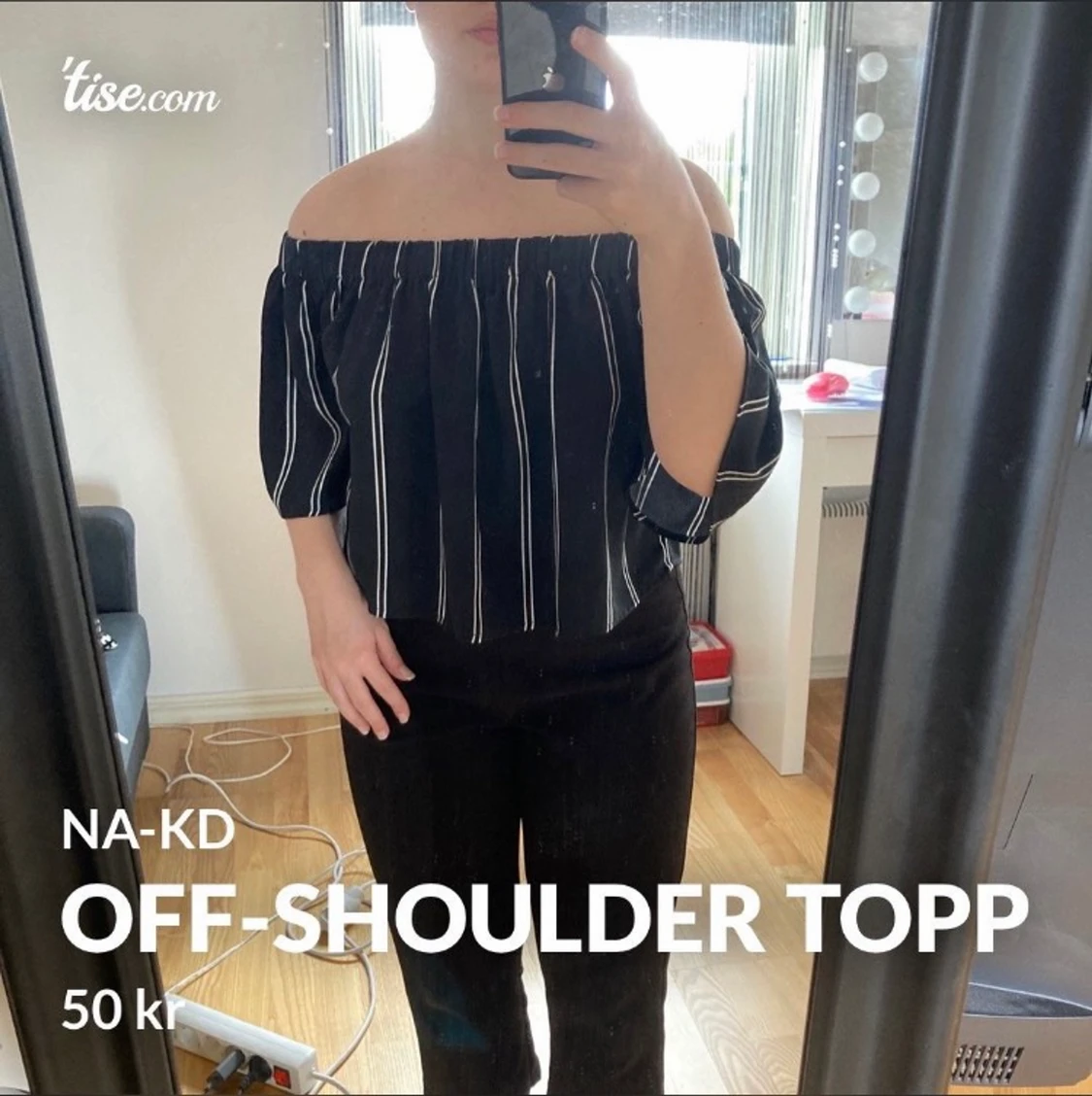 Randig off-shoulder topp/blus från NA-KD i storlek 36. Något kortare i modellen och stretchig resår upptill som håller den på plats utan att den sitter för tight på. Endast använd en gång så är i nyskick!
