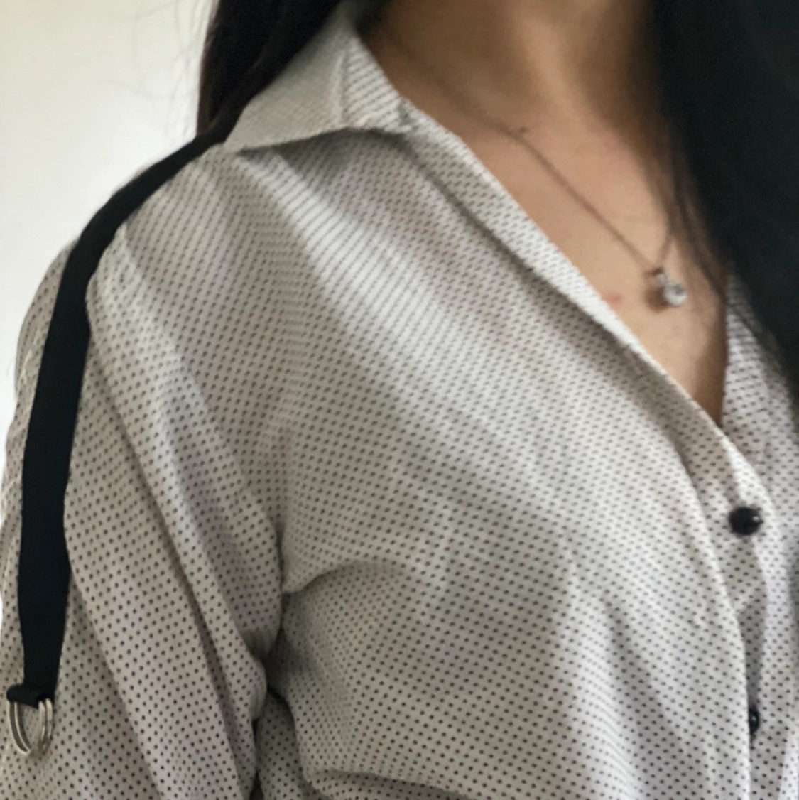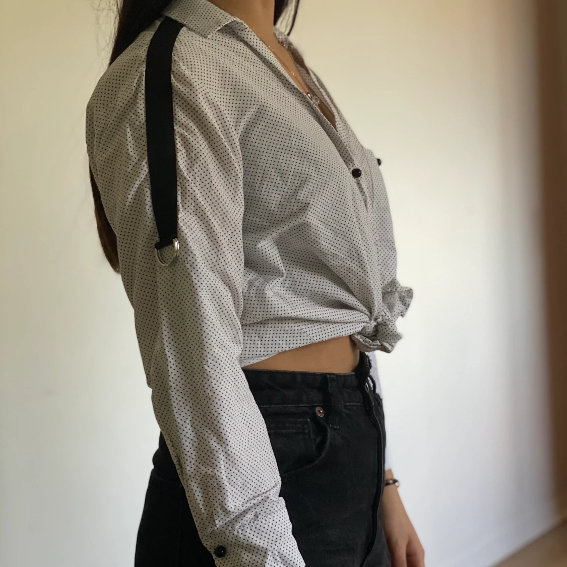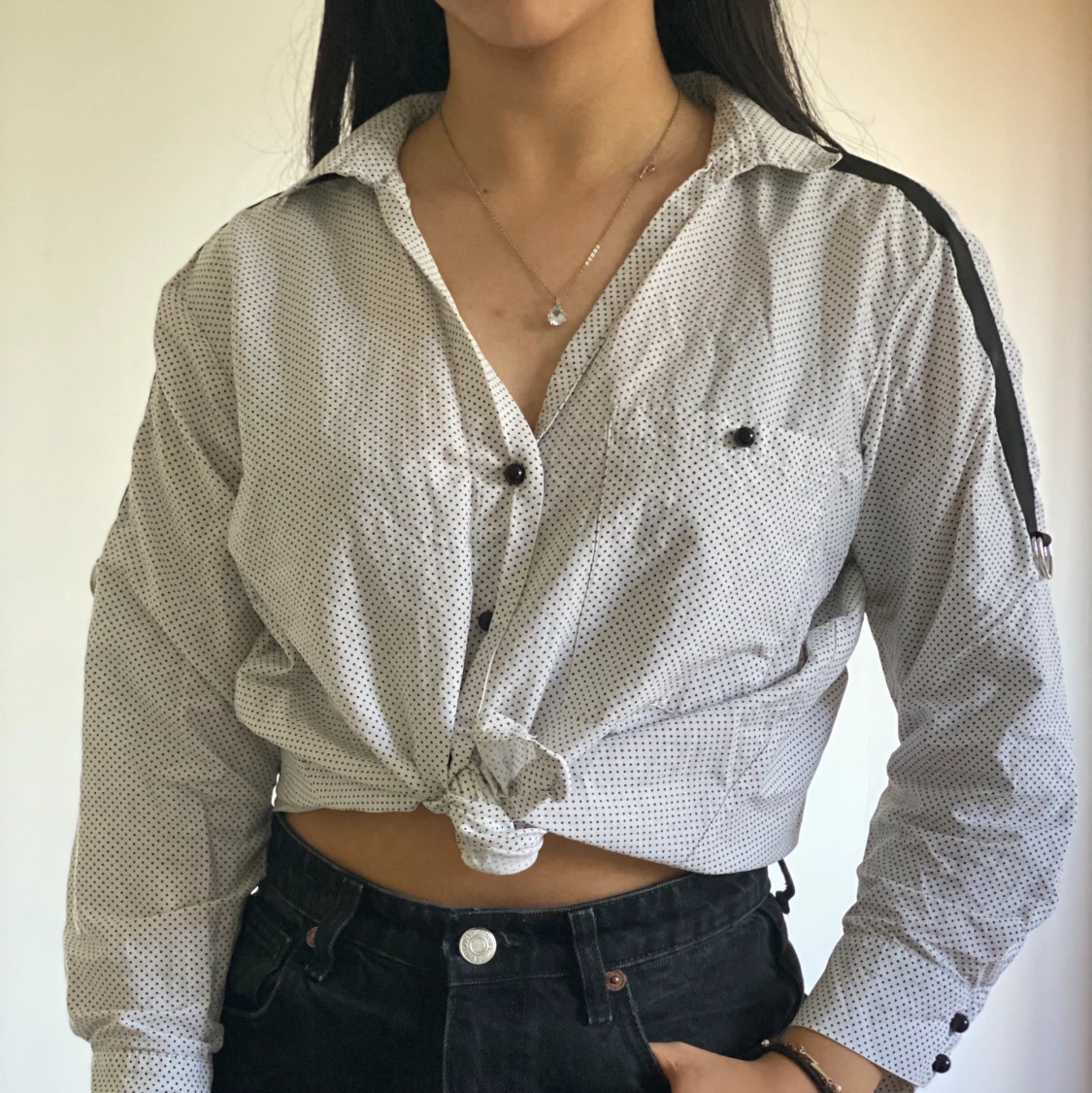 Svart och vit skjorta med svarta detaljer på axlarna. Använd fåtal gånger och i väldigt bra skick! (Notera att skjortan får att bära både uppknutet och ned)