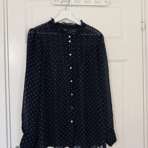 Blus i halvtransparent blå med vita prickar Superfin krage och smickrande på Nyskick
