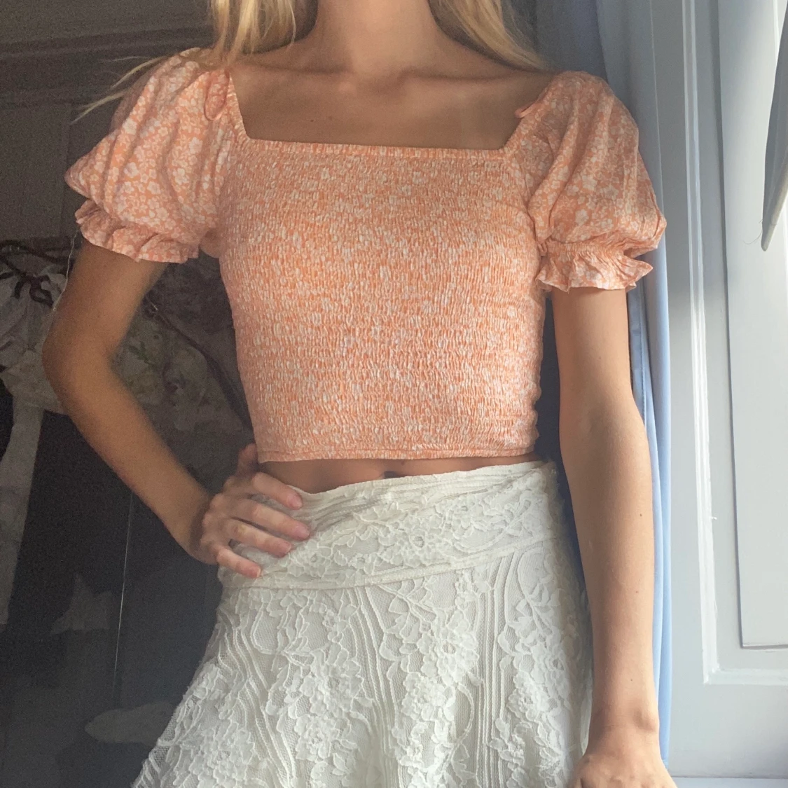Säljer denna super söta puffärms toppen i färgen coral med vita blommönster, toppen har även puffärmar