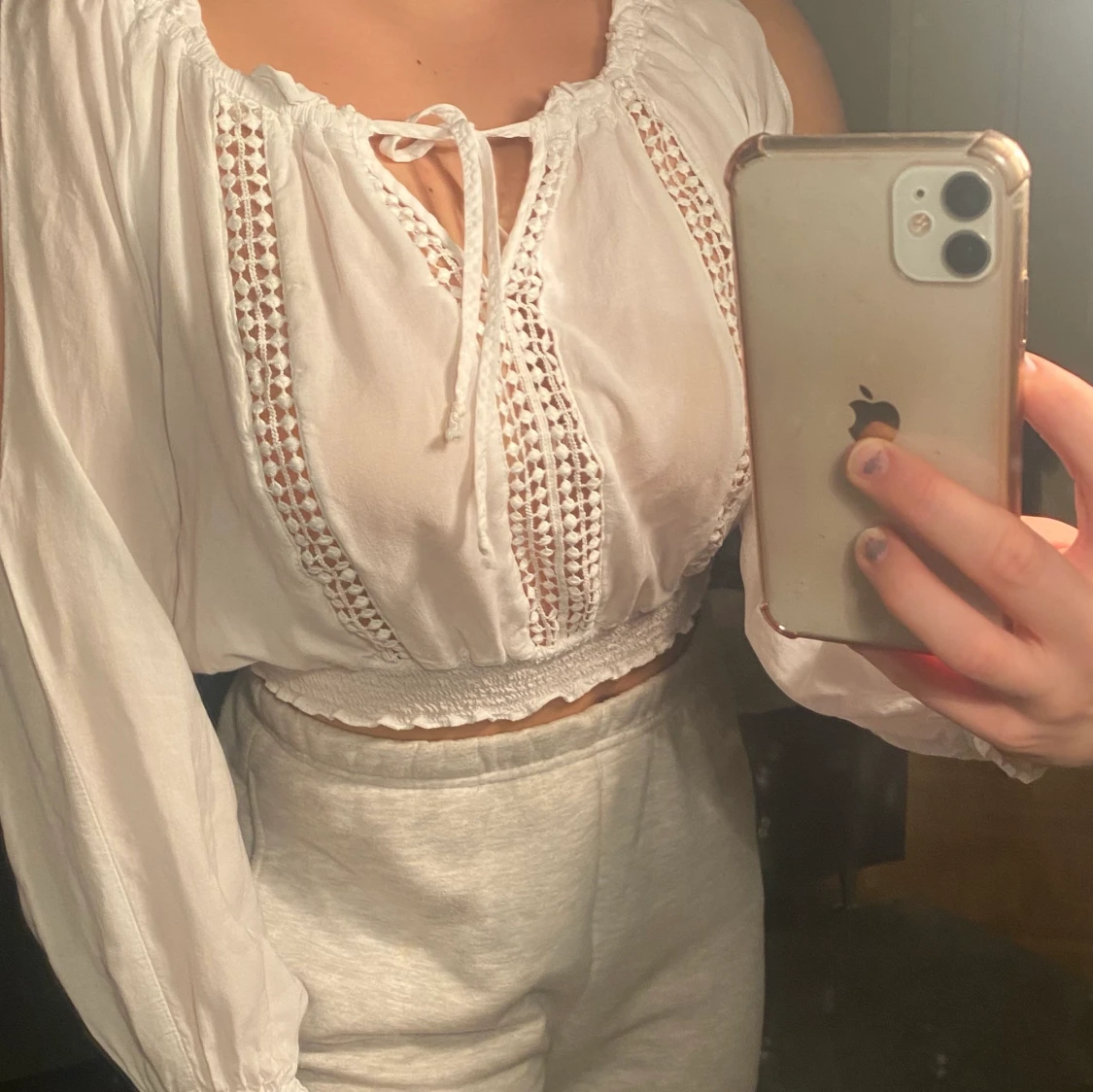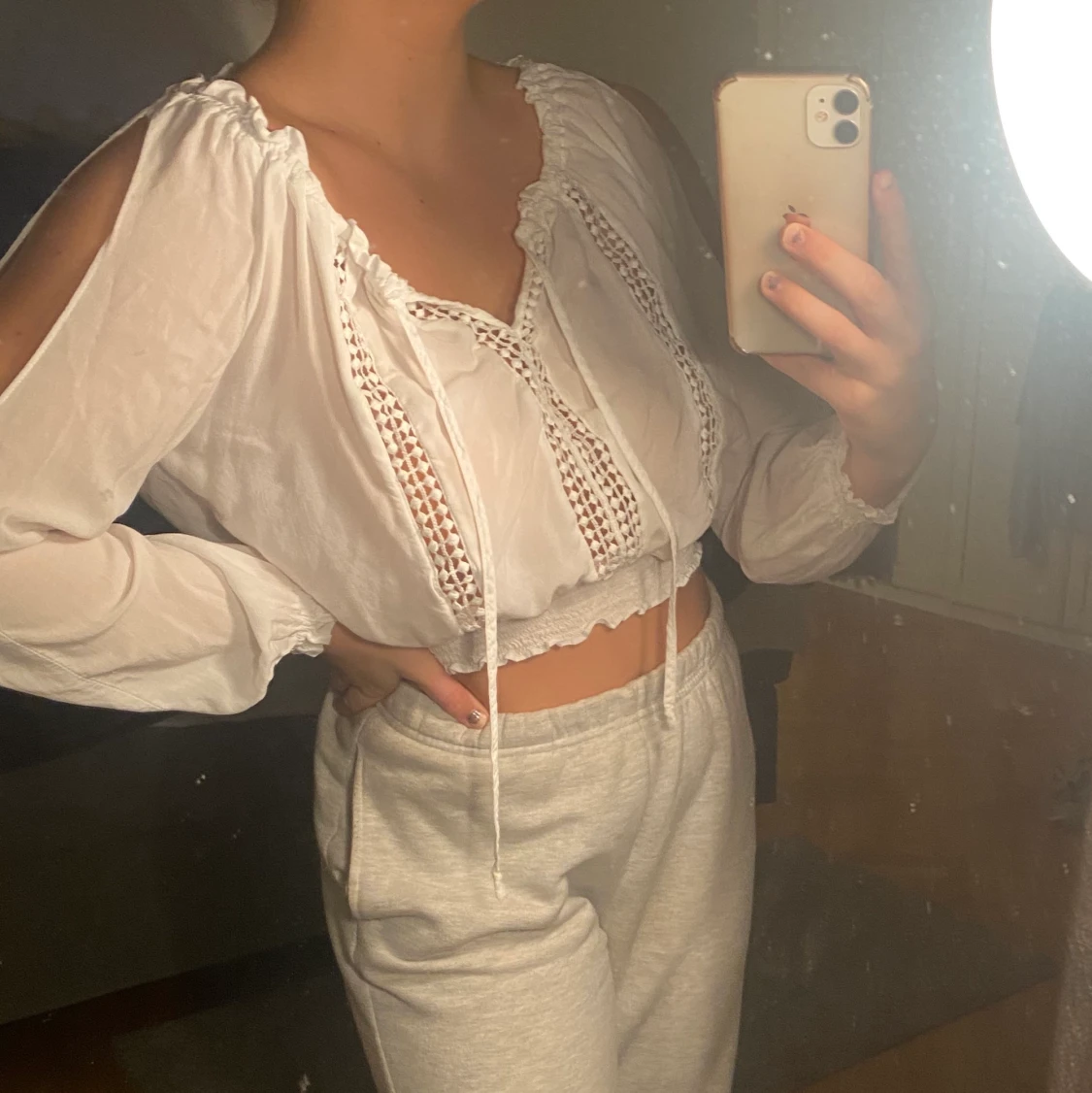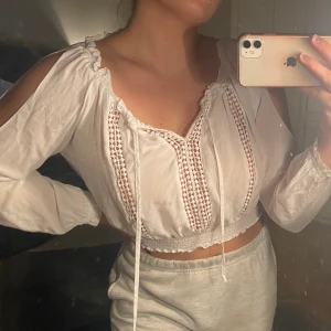 Vit fin blus storlek 36/S. Som ny. Öppna axlar och med snöre som man kan knyta (se bild 3)