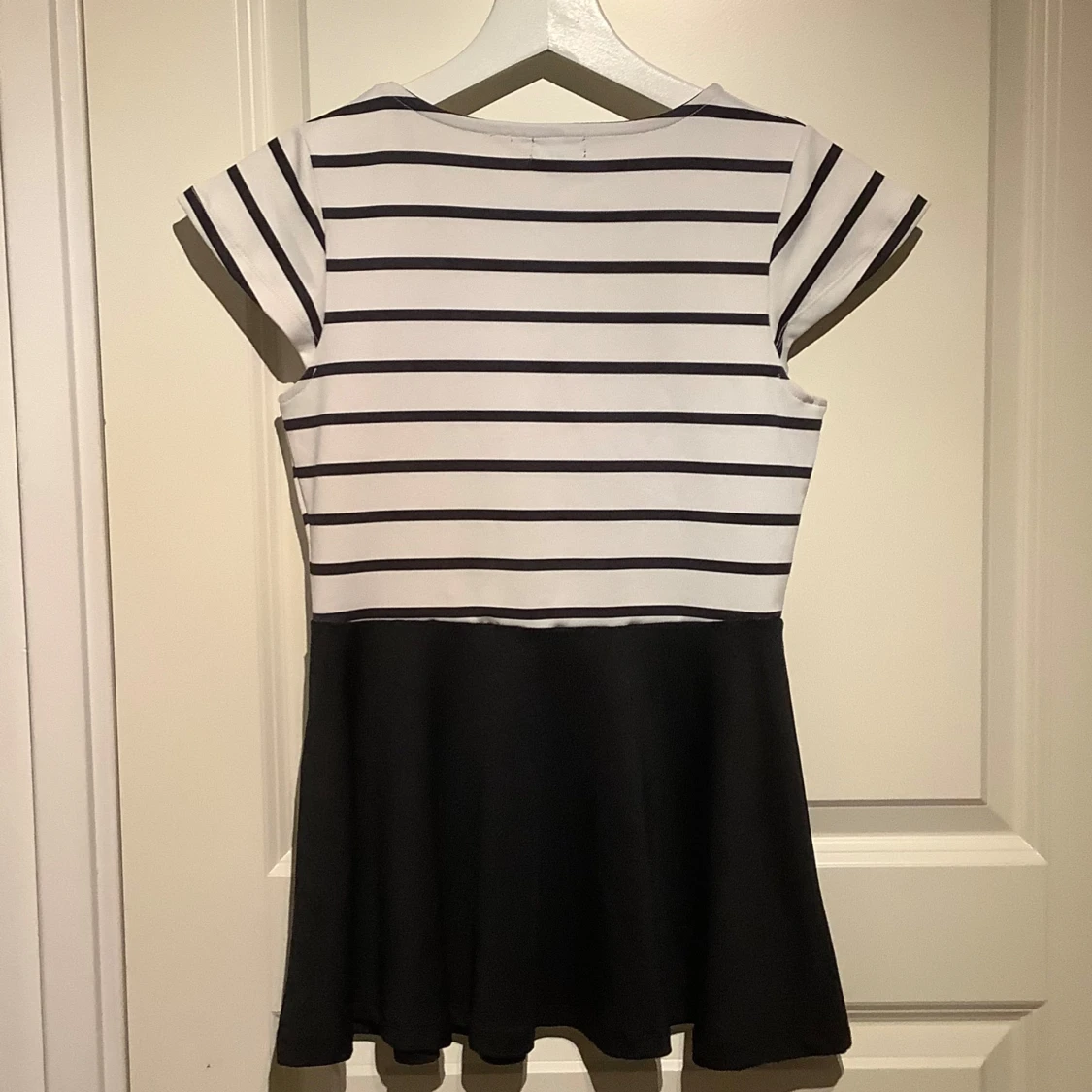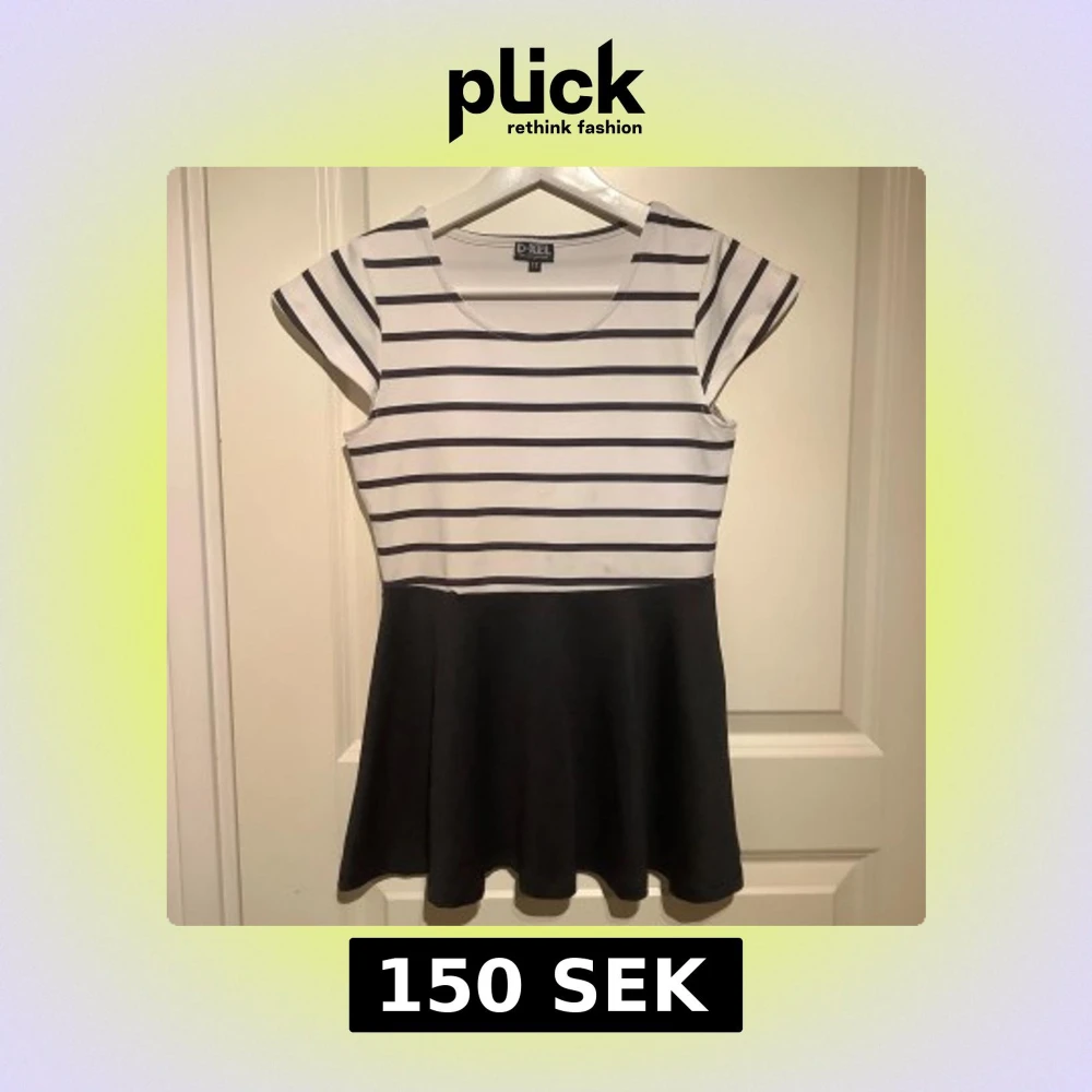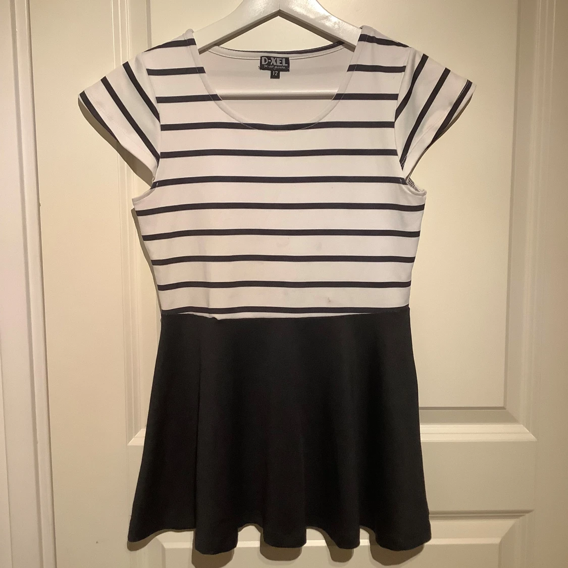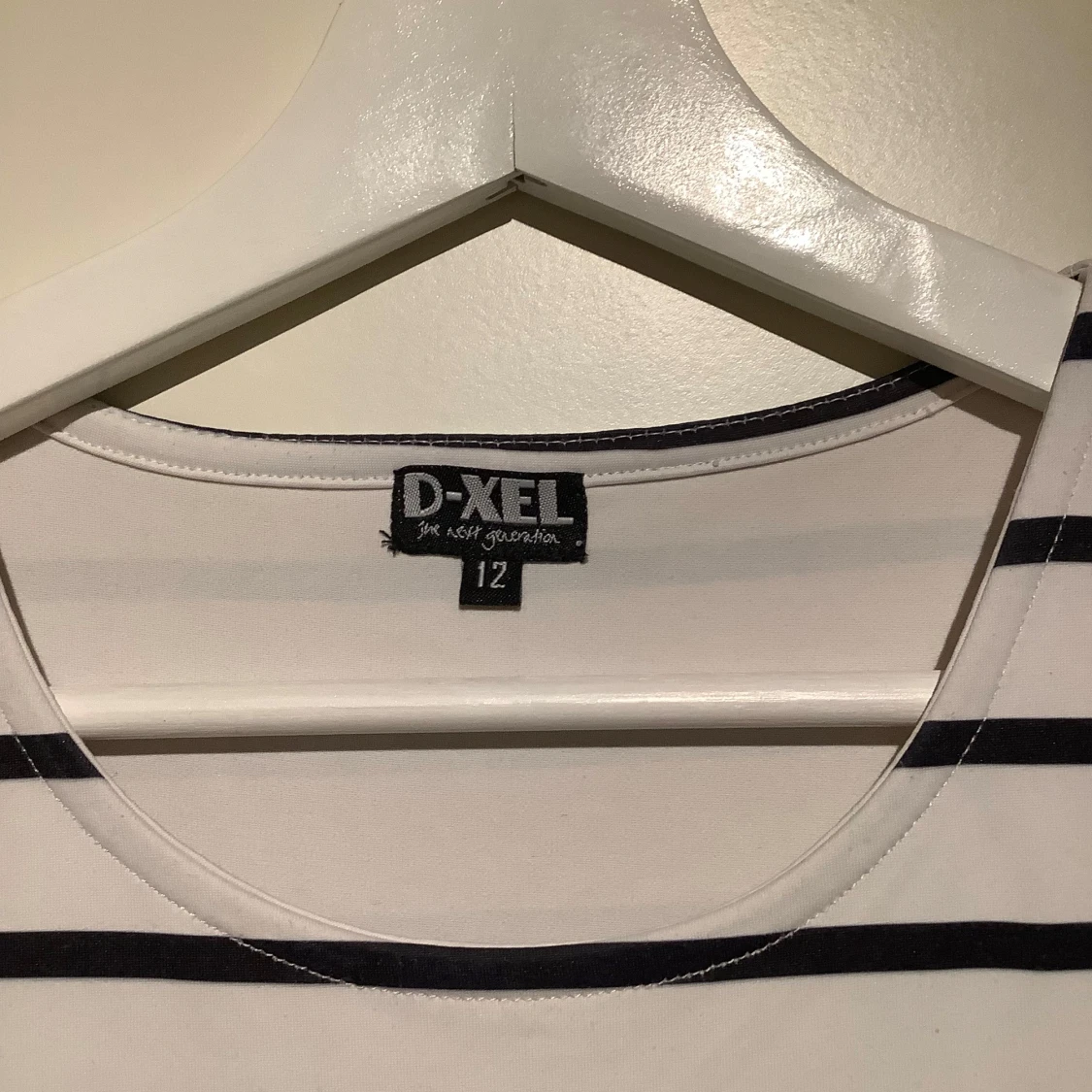 Säljer en söt topp från D-XEL med randigt mönster upptill och enfärgad utsvängd volang. Toppen har korta ärmar och en rund halsringning. Perfekt för en avslappnad stil.