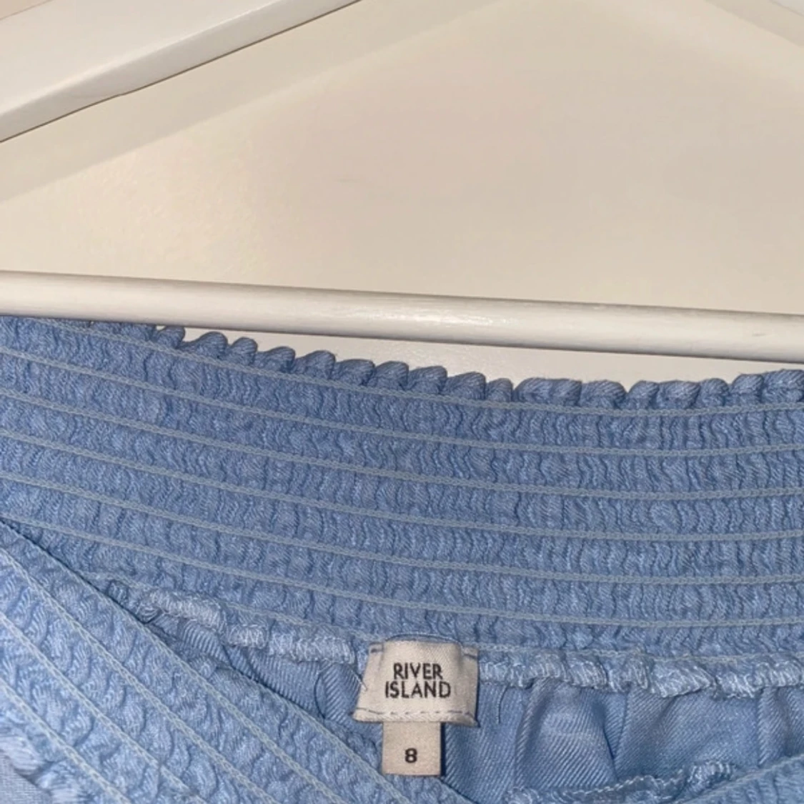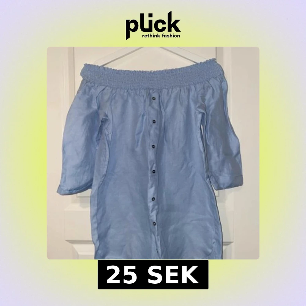Säljer en ljusblå kortklänning från River Island med offshoulder-design och knappar framtill. Klänningen har trekvartsärm och är gjord i ett mjukt bomullsmaterial. Perfekt för sommarens alla tillfällen, snygg och bekväm med smock upptill.
